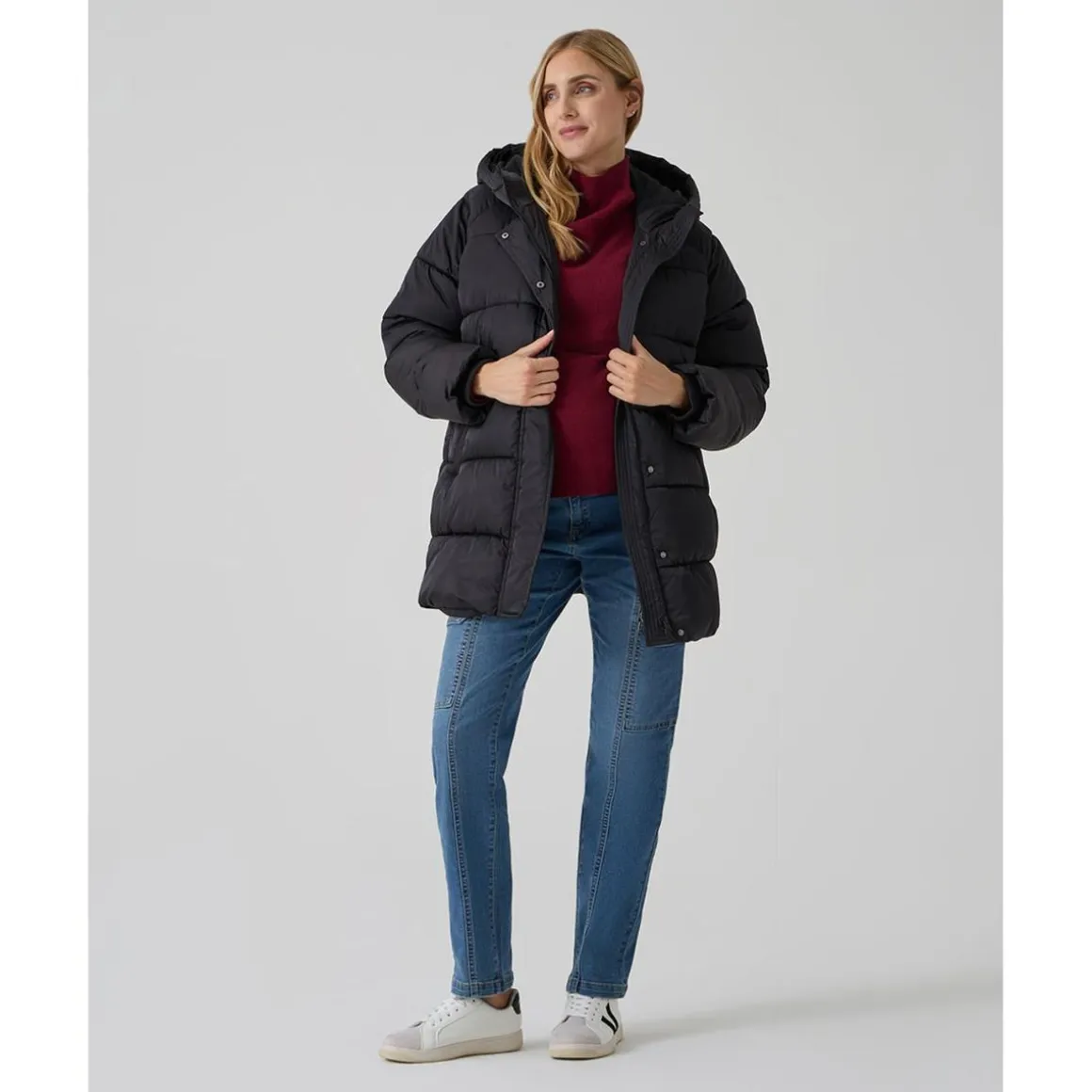 El abrigo premamá en negro es una prenda esencial para el invierno. Su corte largo, con capucha y bolsillos laterales, proporciona máxima protección contra el frío y comodidad durante todo el embarazo.
