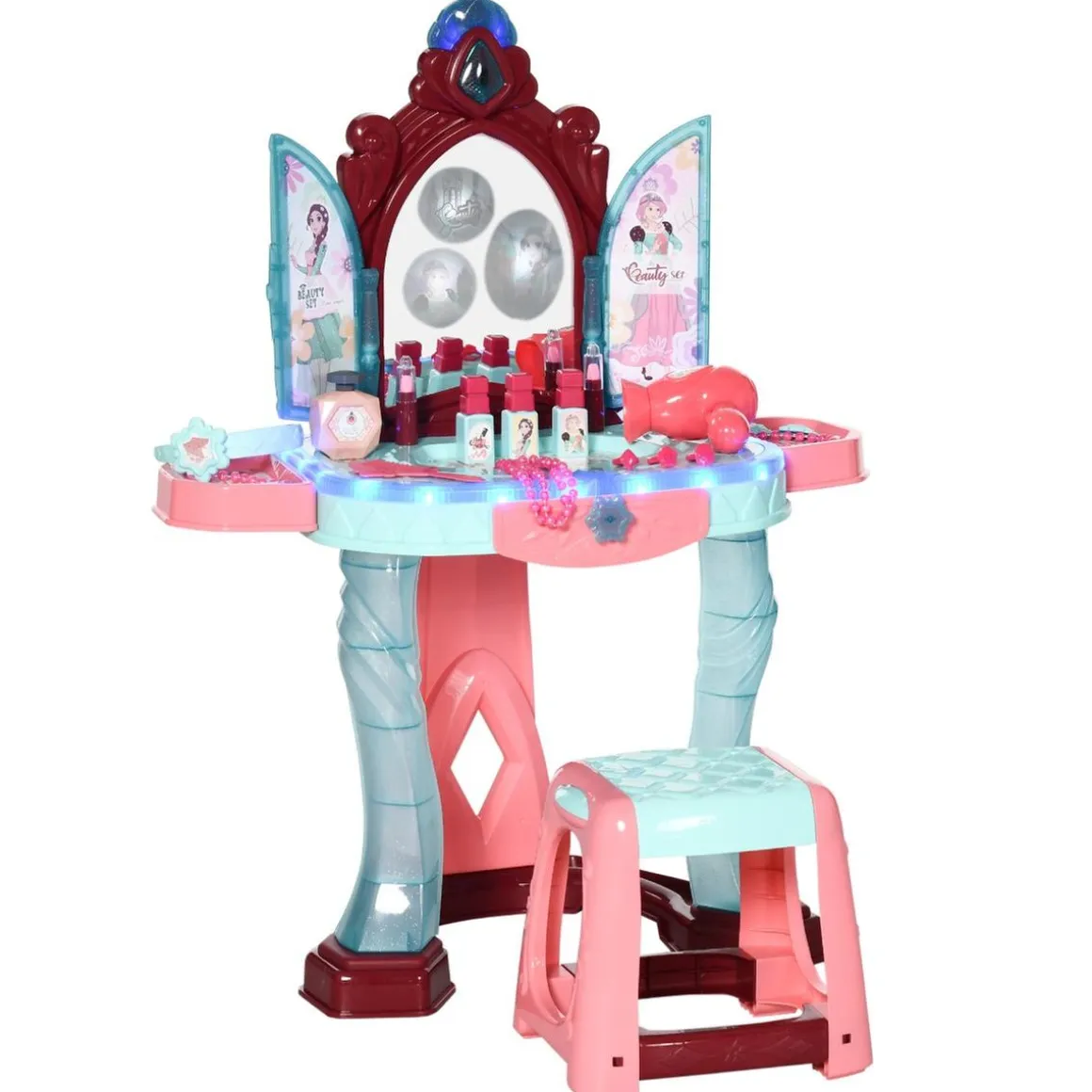 Con un diseño estilo princesa, viene con el taburete a juego y cuenta con un espejo mágico y muchos accesorios incluidos, entre ellos, pintalabios, esmalte de uñas y peine.