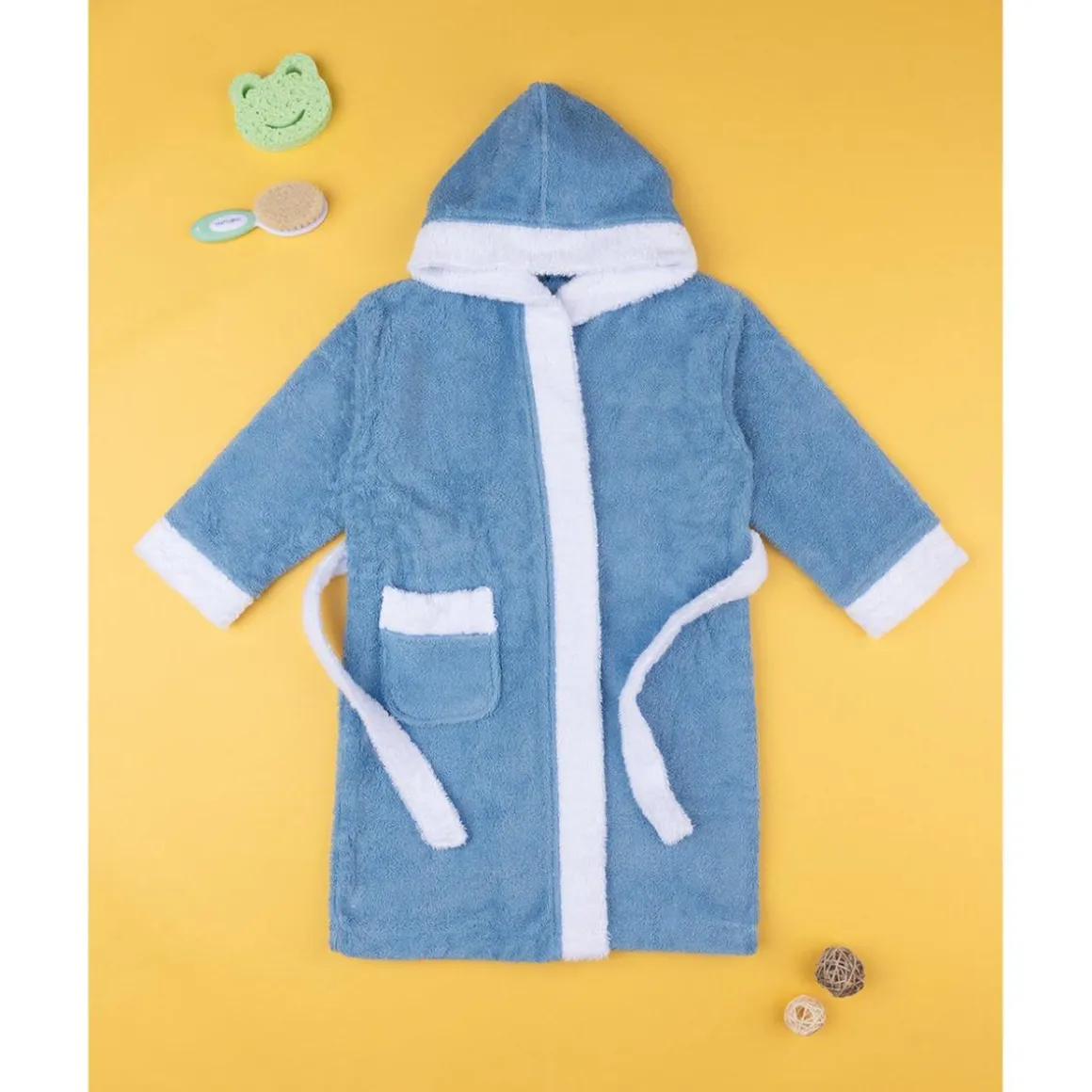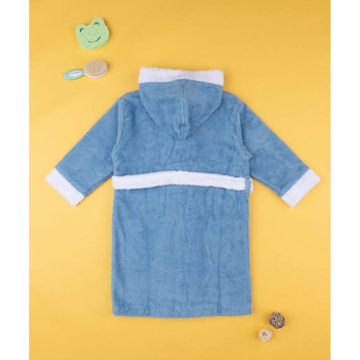 Clásico albornoz de rizo azul oscuro con capucha y todo ribeteado en blanco. Un cómodo cinturón blanco cierra la prenda. Bolsillos en la parte frontal. Accesorios no a la venta. El paquete contiene solo la prenda de vestir.