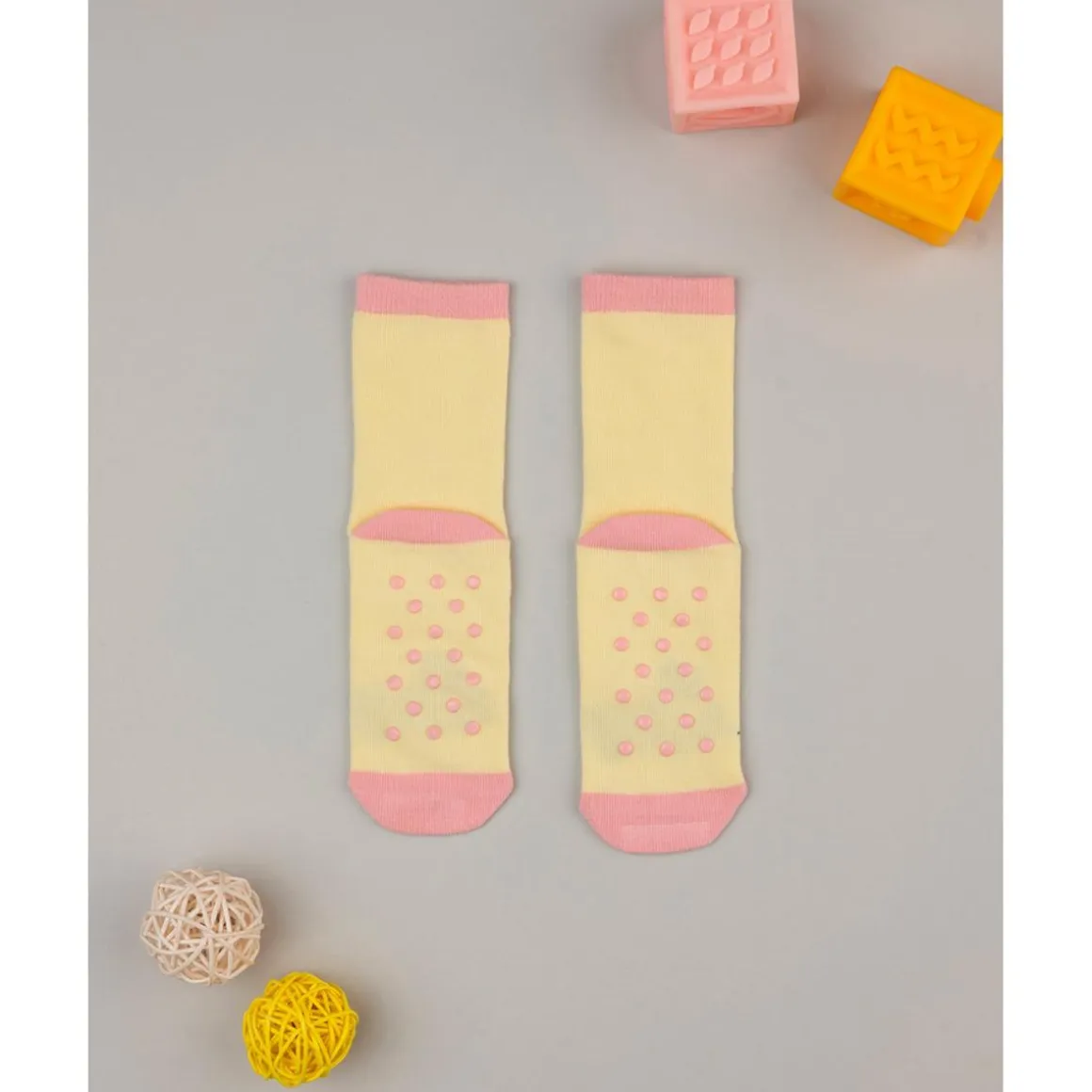 Calcetines antideslizantes coloridos para niña. La prenda se desarrolla sobre una base amarillo pastel con detalles coordinados. El uso no provoca molestias, las gomitas en la planta garantizan estabilidad. Accesorios no en venta. El paquete contiene solo la prenda de vestir.