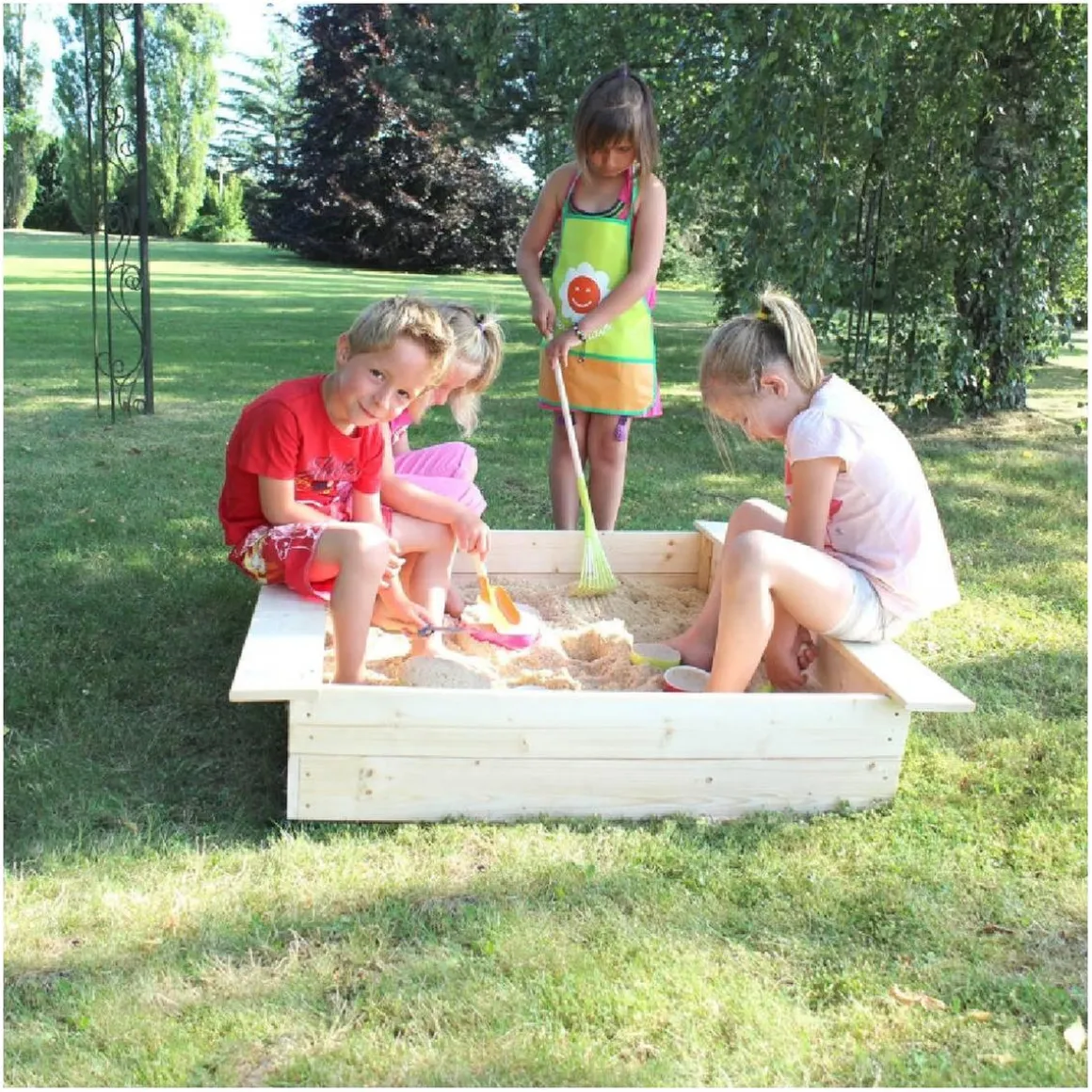Fabricado en pino macizo procedente de bosques gestionados de forma responsable, el arenero de madera es un producto ecológico que cumple con las normas de seguridad vigentes. Es recomendable teñir la madera en bruto para mejorar su resistencia a la intemperie. También puedes pintarlo en el color favorito de tus hijos.