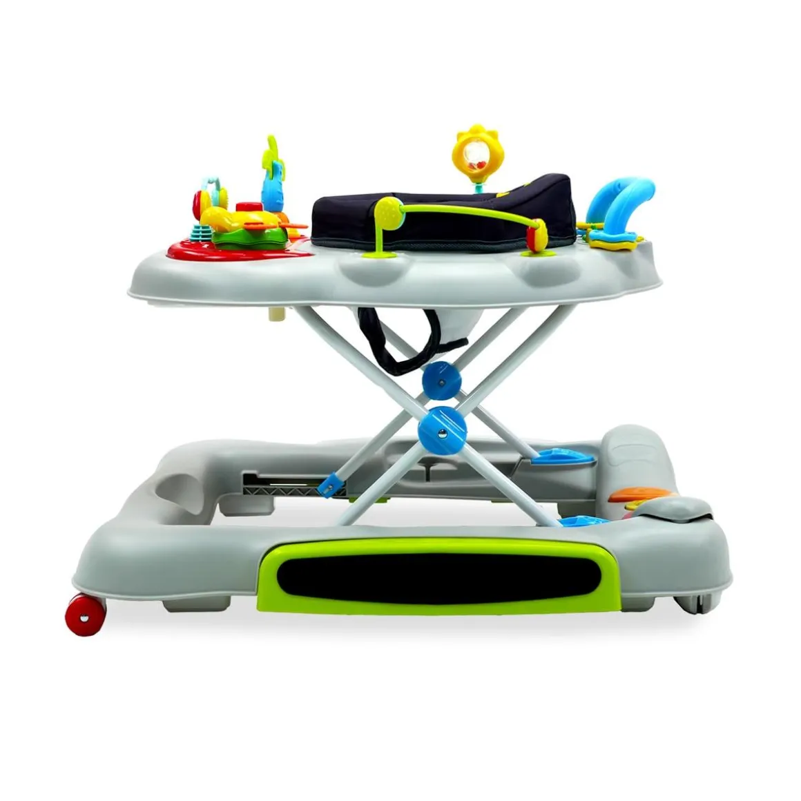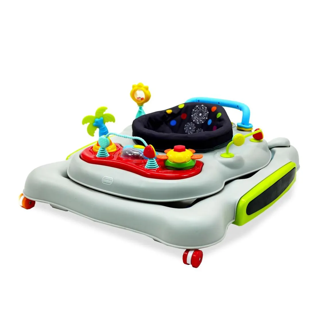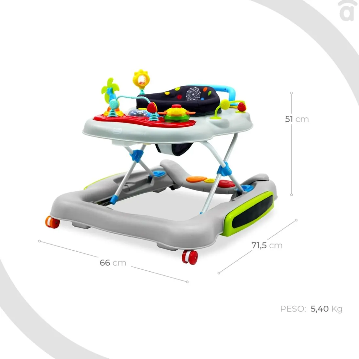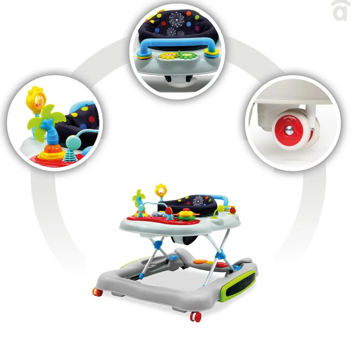 Además, incluye una bandeja de pie musical de 2 posiciones con función de saltador, ruedas de silicona con función giratoria y 6 frenos para un uso más seguro.