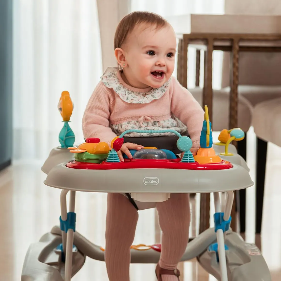 Cuando tu peque comience a caminar querrá recorrer todos los rincones de la casa. Por esta razón, hemos incorporado un asiento giratorio en 360º para que pueda avanzar en todas direcciones con solo girarse.