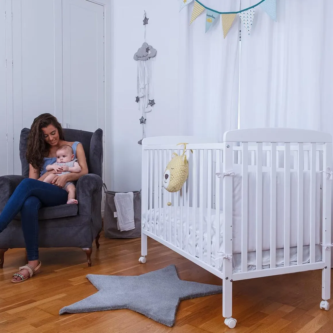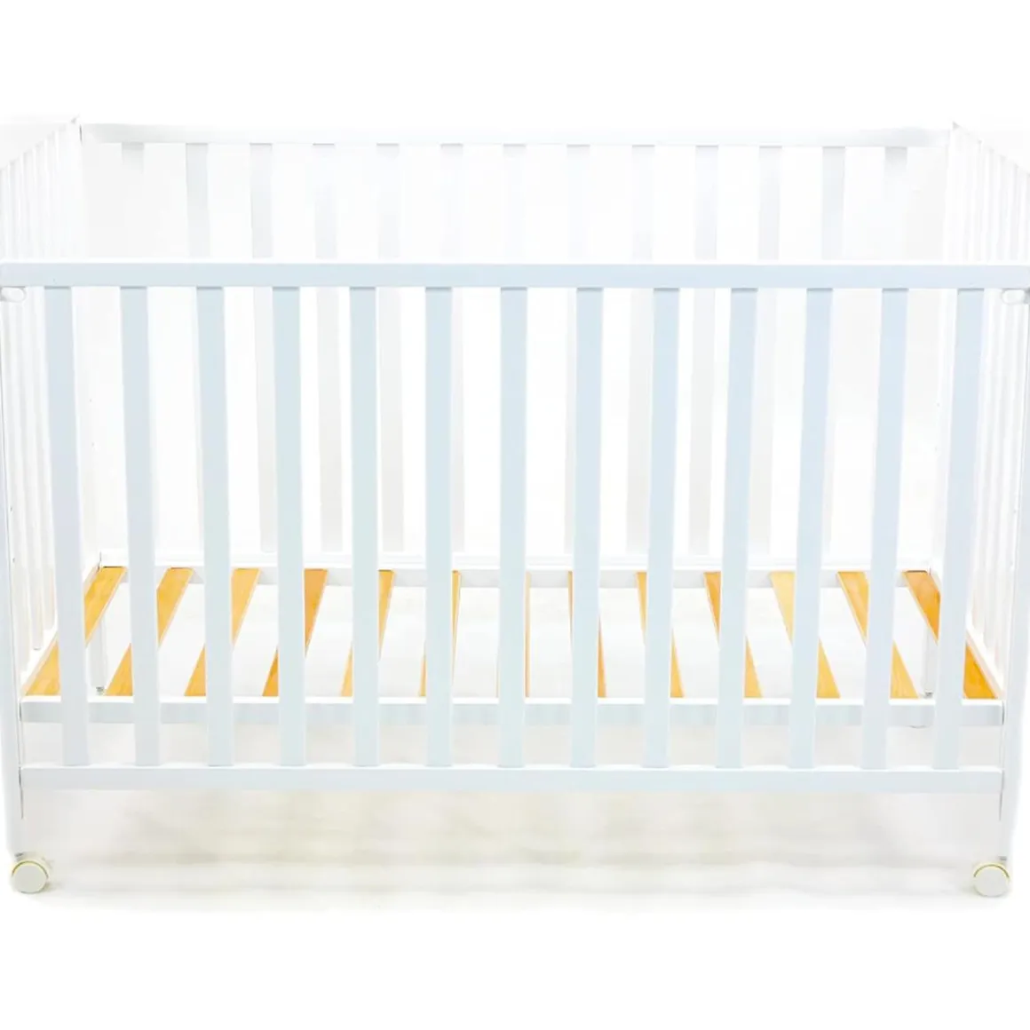 - Ruedas con frenos: Equipada con cuatro ruedas de 4 cm de diámetro que facilitan el desplazamiento de la cuna por la habitación. Todas las ruedas incluyen frenos para asegurar la estabilidad y seguridad del bebé.
