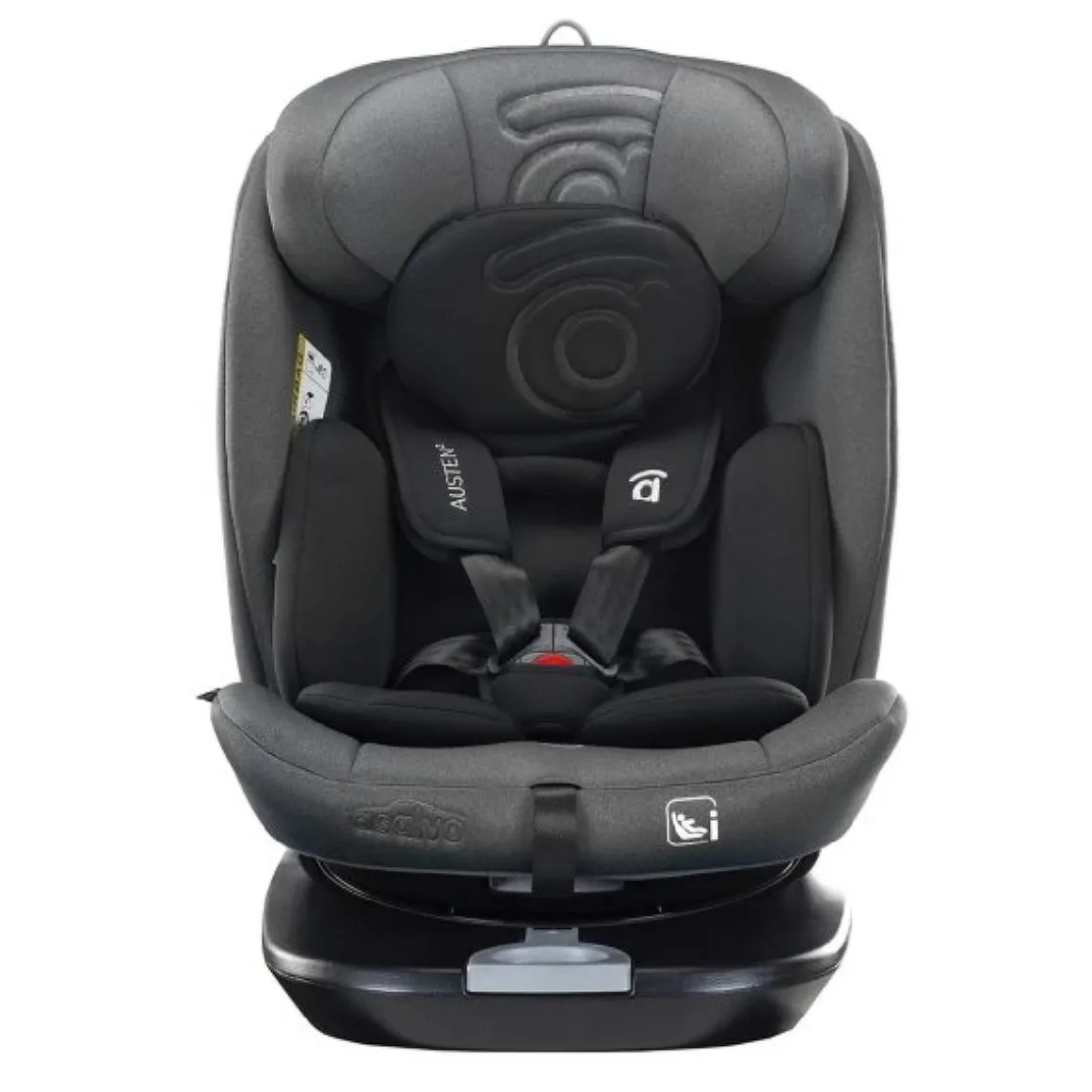 Asalvo – Silla de auto I-Size Austen 2 Gris 40-150 cm. Para niños de 40 a 150 cm de estatura. Ofrece una instalación segura con el sistema Isofix y top tether, brindando tranquilidad a los padres. Este asiento giratorio 360º permite una versatilidad excepcional, y su capacidad de orientación contramarcha hasta los 76 cm garantiza una seguridad óptima.