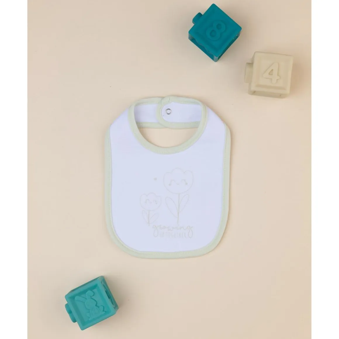 Babero casual para niña con base blanca y estampado verde claro. Ajuste práctico con botón automático. Solo el babero.