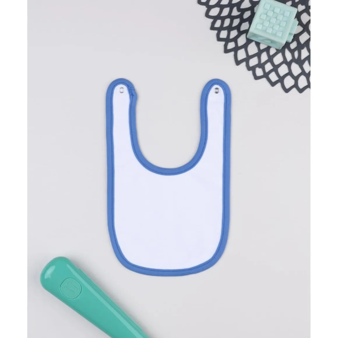 Características: Babero blanco, estampado Dino azul, cierre con botón automático, tejido seguro Oeko-Tex, práctico y cómodo.