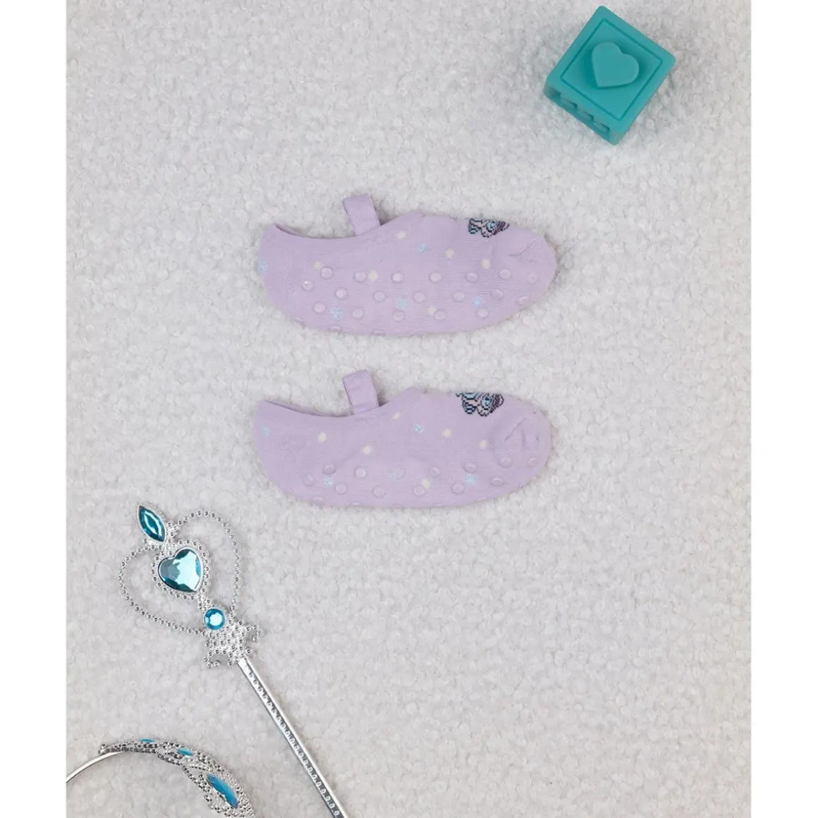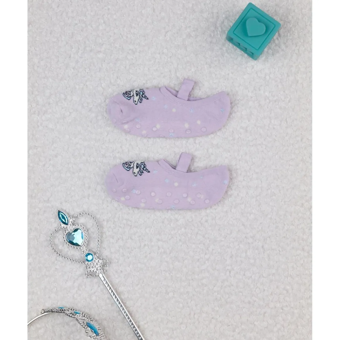 Prácticas bailarinas antideslizantes para niña en color lila con bordados decorativos en contraste. Un práctico elástico completa la prenda garantizando una cómoda vestibilidad. Parte inferior con goma antideslizante. Accesorios no a la venta. El paquete contiene solo la prenda de vestir.