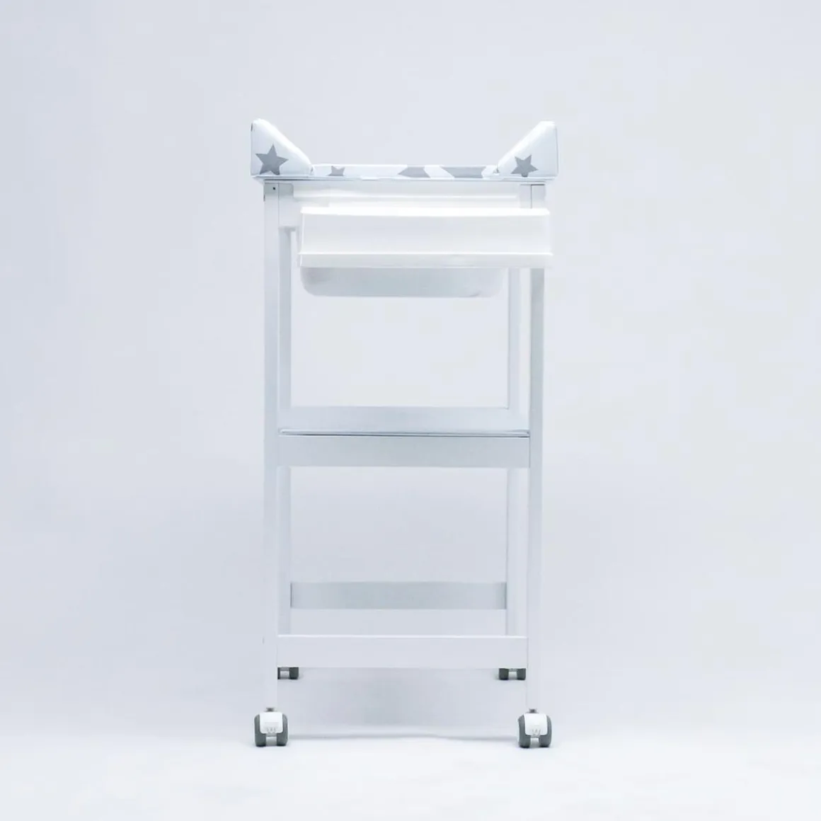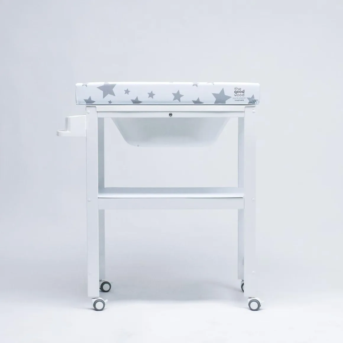 Bañera de Madera Estrellas Blanco. Bañera de Madera Sobrebidé con cambiador, muy funcional y práctica, con estructura de madera de haya natural lacada. Dispone de ruedas (con banda de goma) que facilitarán el traslado al lugar que prefieras para el baño del bebé.
