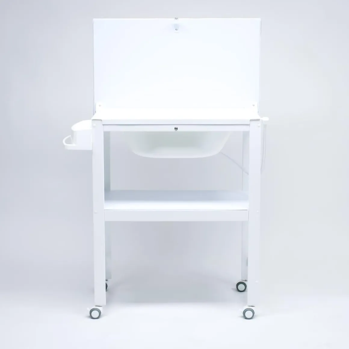 Tiene la cubeta rigida y, además, dispone de una estanteria de madera forrada de PVC muy práctica, para que puedas almacenar todo lo que necesita el bebé en el momento del baño. Cuenta también con manguera desagüe y cestas de plastico.