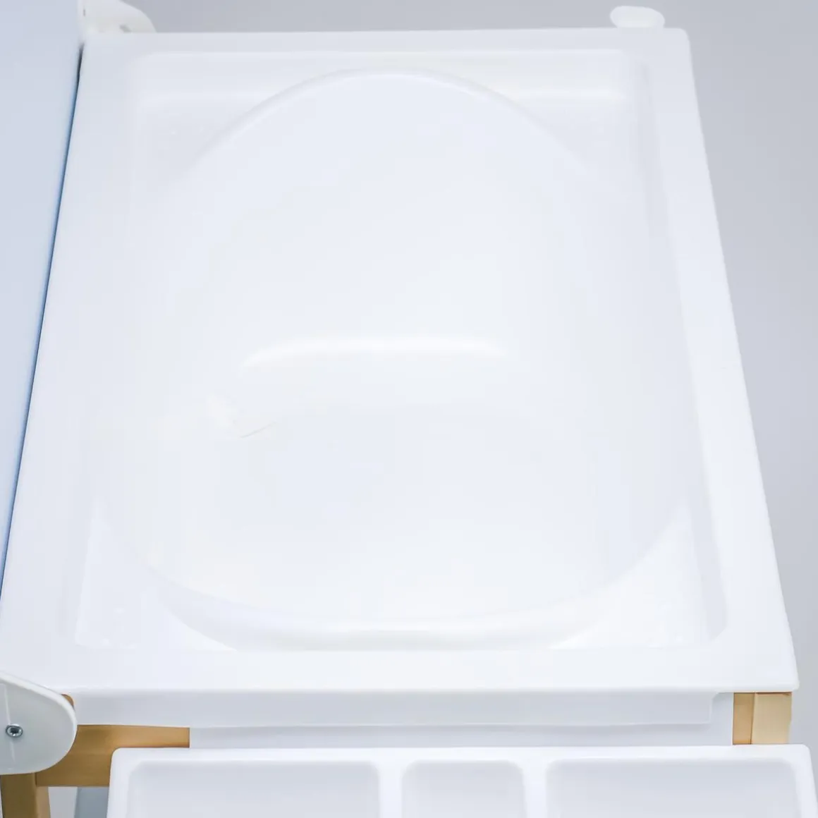 Tiene la cubeta rigida y, además, dispone de una estanteria de madera forrada de PVC muy práctica, para que puedas almacenar todo lo que necesita el bebé en el momento del baño. Cuenta también con manguera desagüe y cestas de plastico.