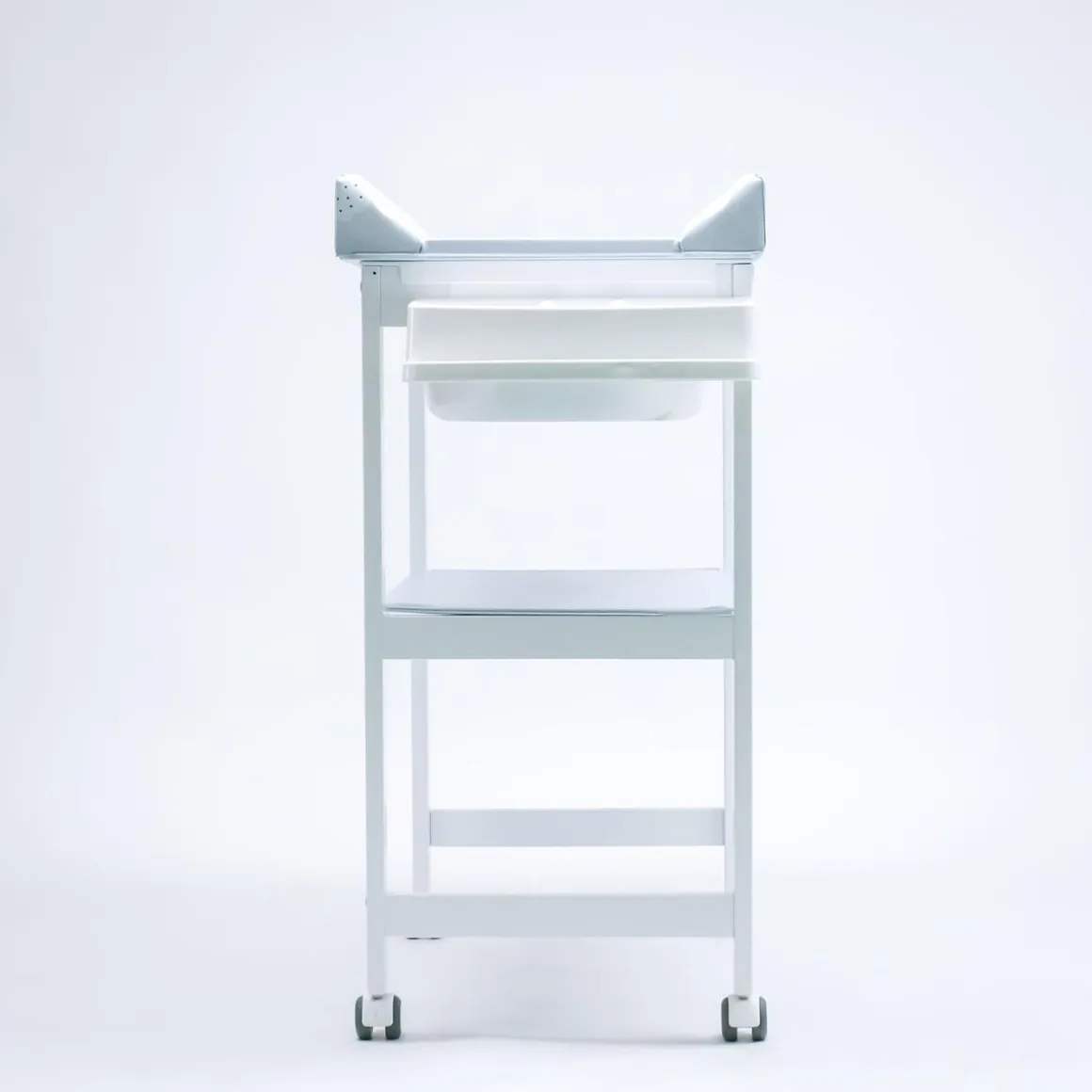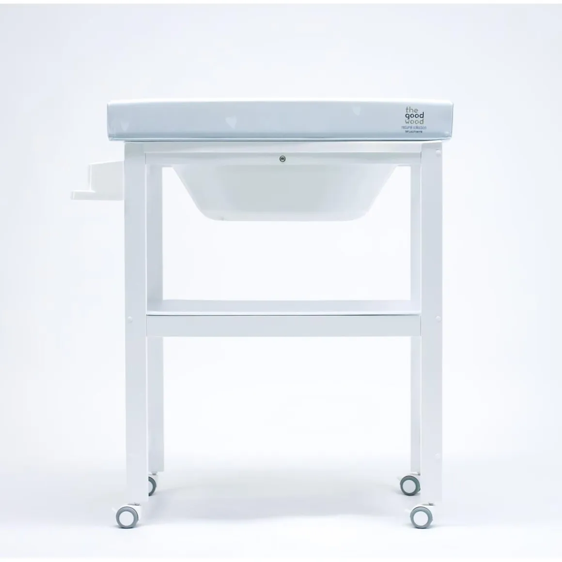 Tiene la cubeta rigida y, además, dispone de una estanteria de madera forrada de PVC muy práctica, para que puedas almacenar todo lo que necesita el bebé en el momento del baño. Cuenta también con manguera desagüe y cestas de plastico.