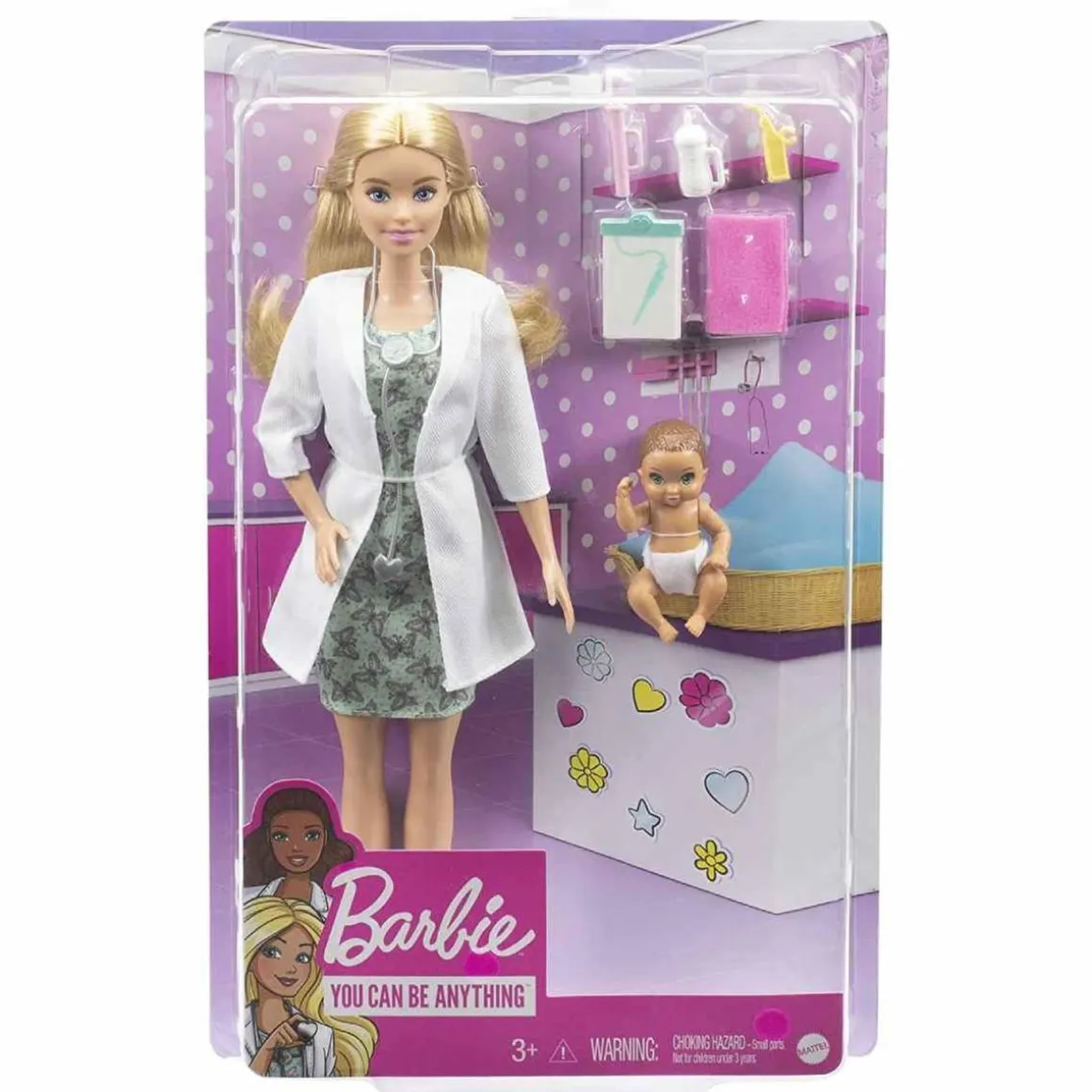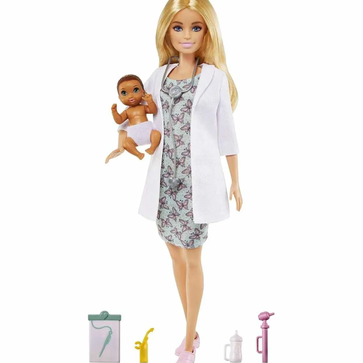 El conjunto incluye la muñeca Barbie Pediatra (30,4 cm) que lleva un bonito vestido con estampado de mariposas y una bata de médico, y su adorable y pequeño paciente con pañal.