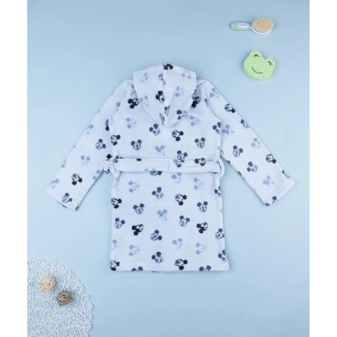 El batín con capucha Mickey Mouse está pensado para los pequeños fans del personaje más querido de Disney. De tejido aterciopelado en azul claro con estampado allover de Mickey, es cálido, suave y muy cómodo. Incluye cinturón a la cintura para un ajuste seguro.