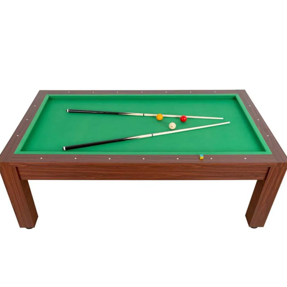 Mesa de billar de fácil montaje. La mesa viene montada a falta de atornillar las patas. La mesa está forrada con tapete de gran duración en color verde. Incorpora niveladores de patas.