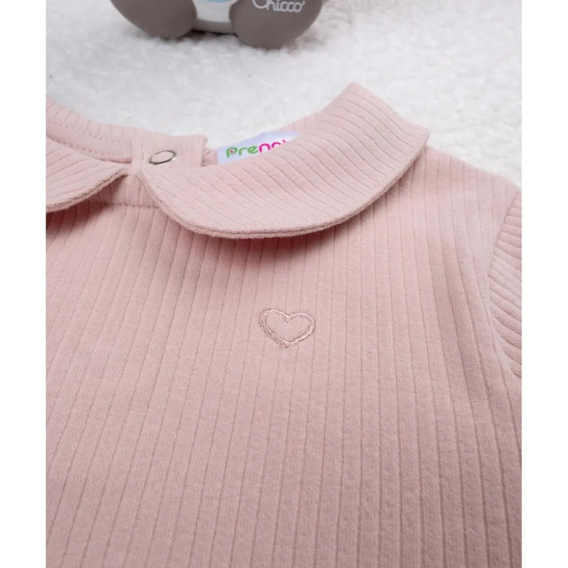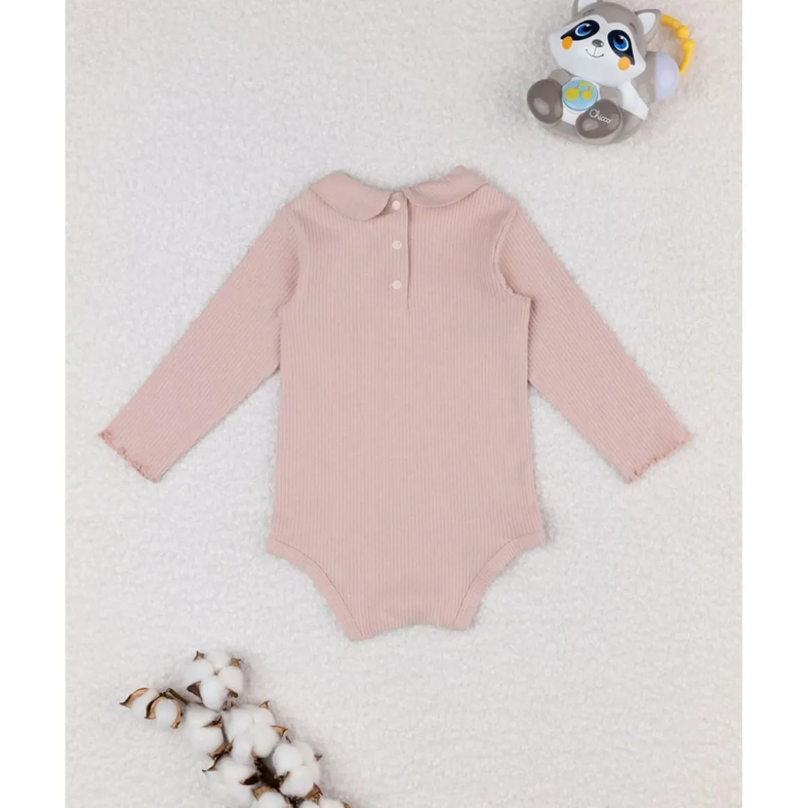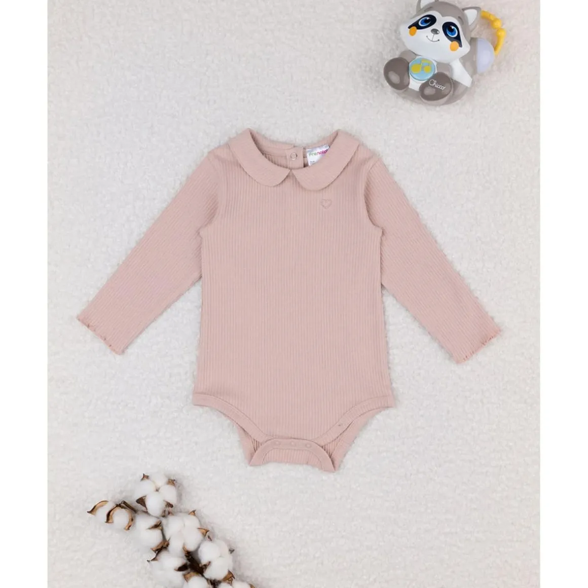 Básico body de manga larga para niña en un suave tono rosa. Cuenta con un cuello a tono y botones automáticos en la parte trasera y la entrepierna para facilitar el cambio. Su diseño cómodo lo convierte en una opción ideal para el día a día.