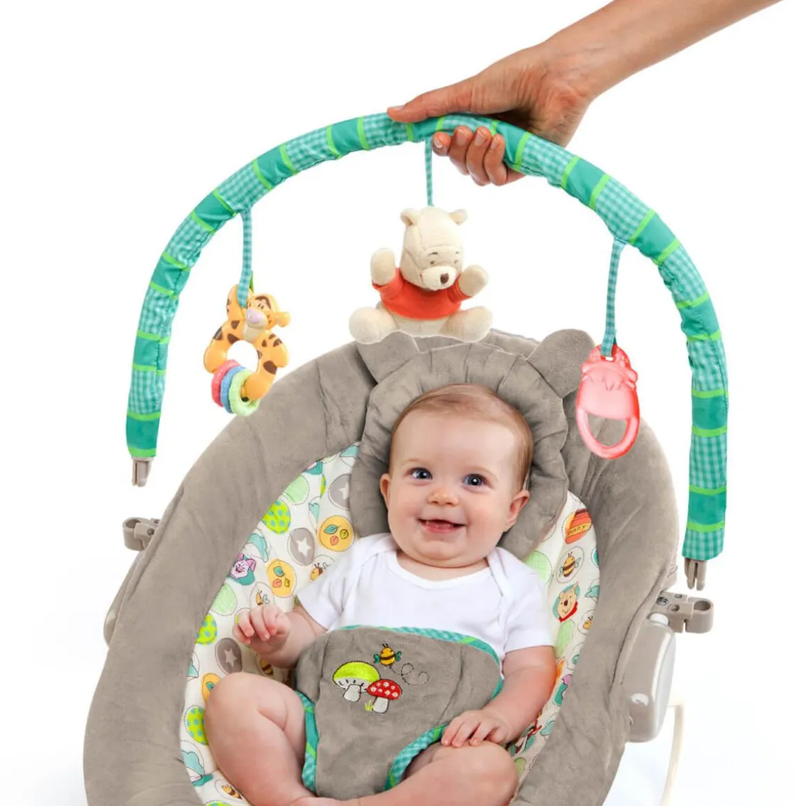 Incluye un arnés holgado y suave para su seguridad, un arco de quita y pon con figuras de Winnie The Pooh que crearán interés en el bebé y estimularán su coordinación motriz y su sentido visual, y un reposacabezas extraíble.