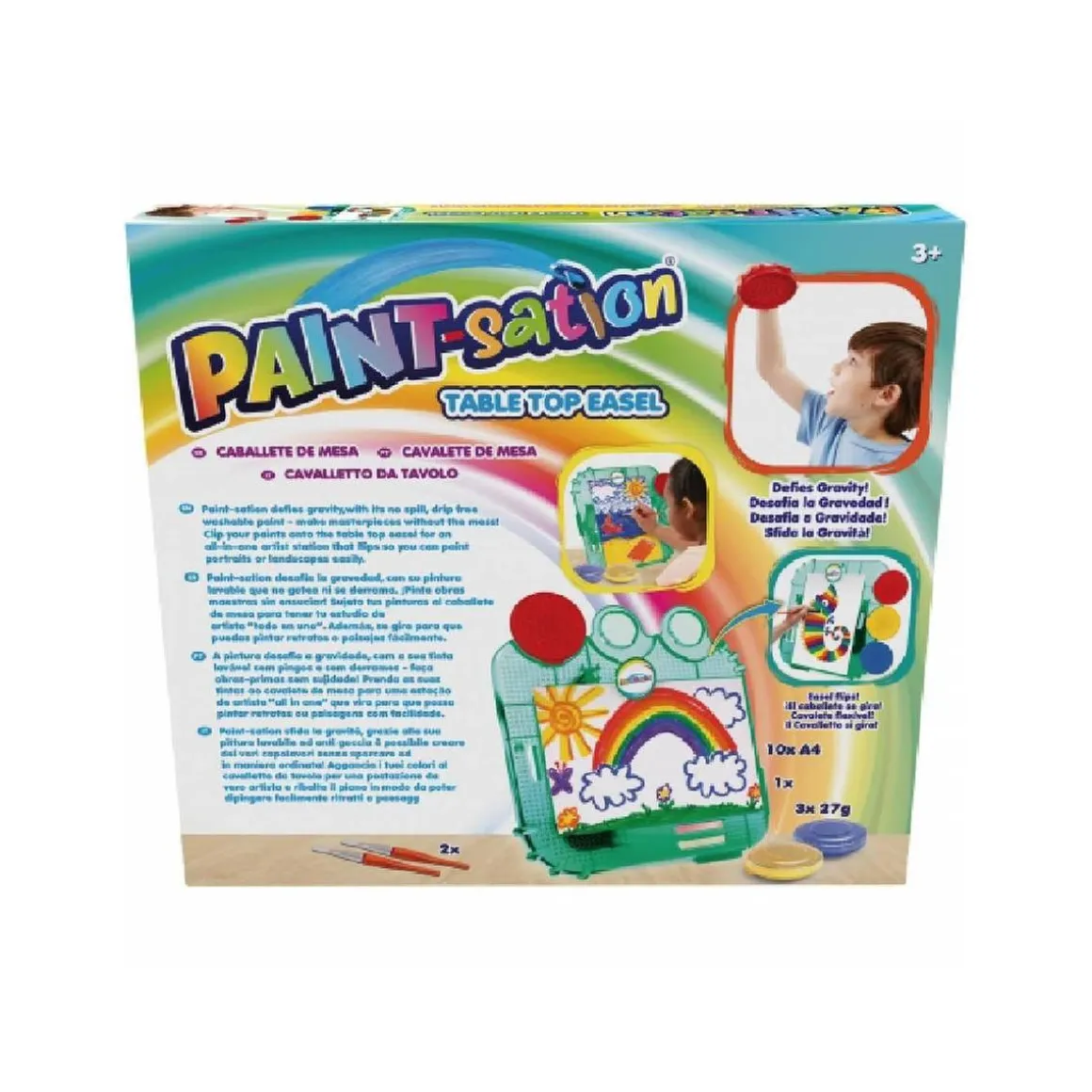 Incluye: 1 caballete de mesa, 3 botes de pintura de 27 gr, 2 pinceles y 10 hojas de papel A4