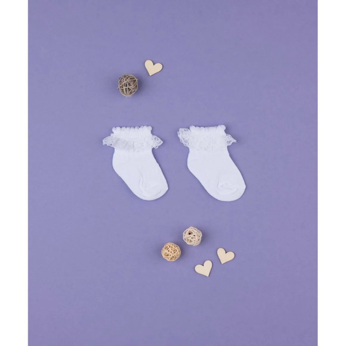 Calcetines para bebé de algodón decorado. Los calcetines se presentan en color blanco liso y están adornados con un refinado encaje blanco en el tobillo. Cómodos y prácticos, estos calcetines son perfectos para conjuntos elegantes y femeninos de bebé. Accesorios no a la venta. El paquete contiene solo la prenda de vestir.