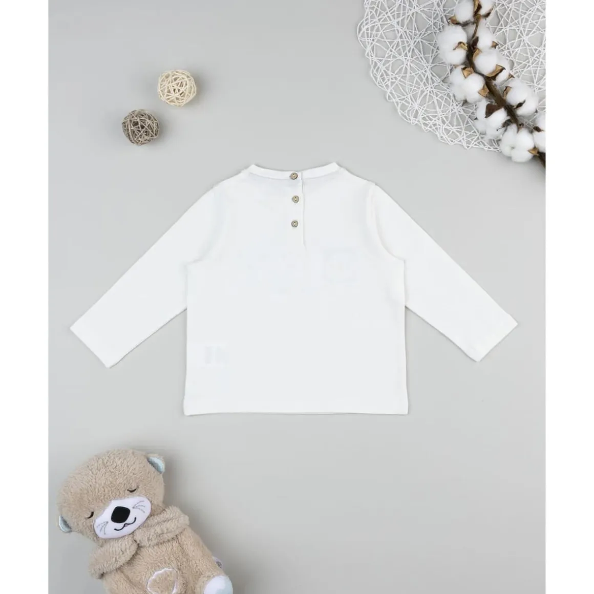 Esta camiseta infantil de manga larga se presenta en algodón elástico, con base blanca y un parche de ositos en la parte frontal. Incluye botones automáticos en la espalda para facilitar la puesta. Confeccionada en algodón certificado OEKO-TEX, es segura para la piel sensible.