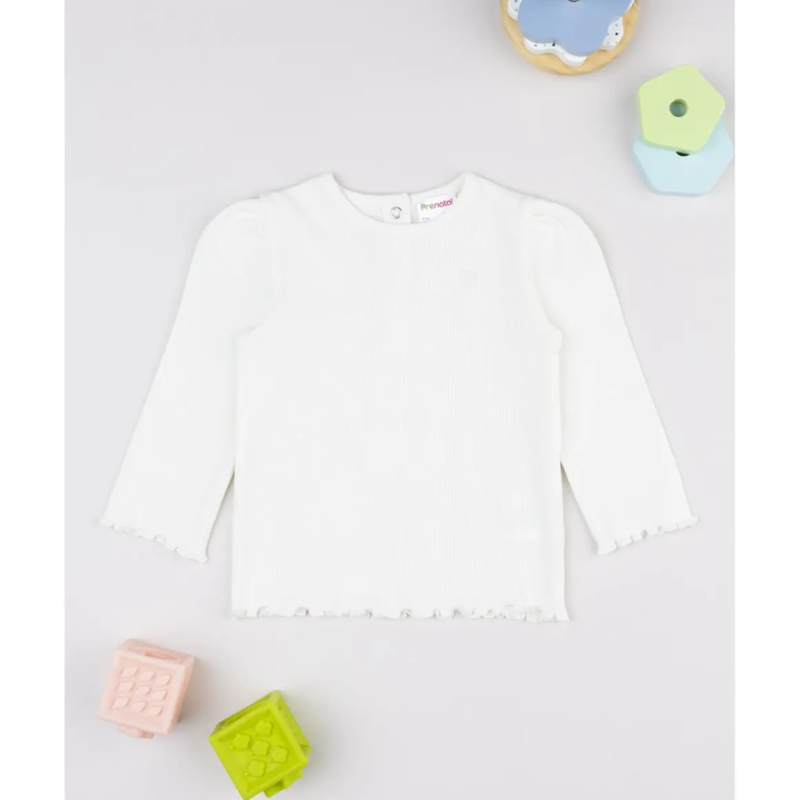 Camiseta básica de canalé para niña, en blanco liso. Suave y cómoda, con botones automáticos en la parte trasera para facilitar el uso diario. Ideal para combinar con cualquier look casual.