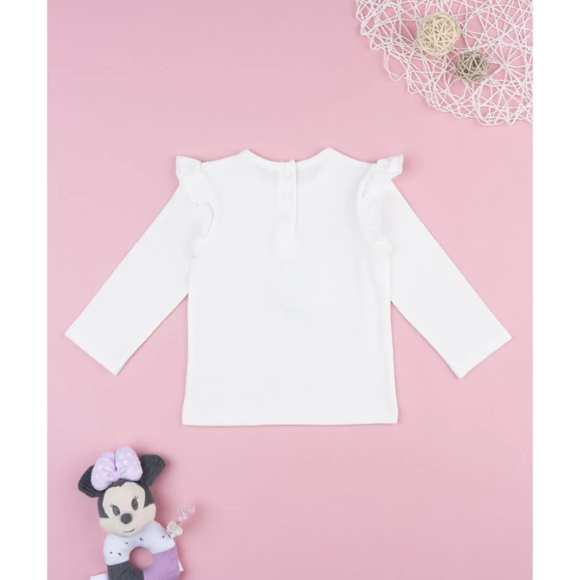 Camiseta casual de manga larga para niña en blanco con estampado Minnie coordinado y detalles frill. Botones automáticos en la espalda facilitan poner y quitar la prenda, asegurando una vestibilidad cómoda.