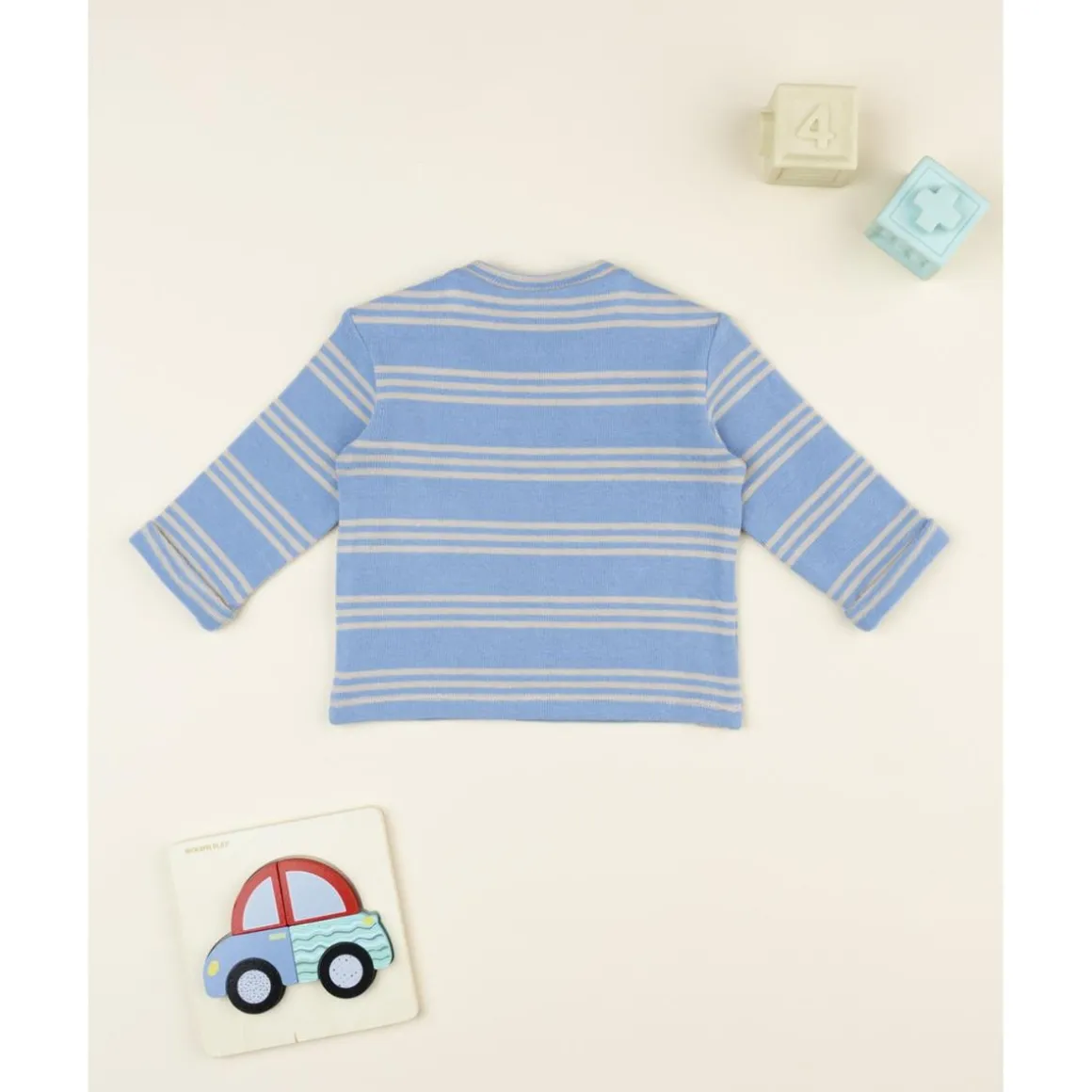 Suave camiseta de manga larga para niño con rayas en tonos azul y gris. De tejido elástico y certificado Oeko-Tex, es cómoda y segura para el uso diario.