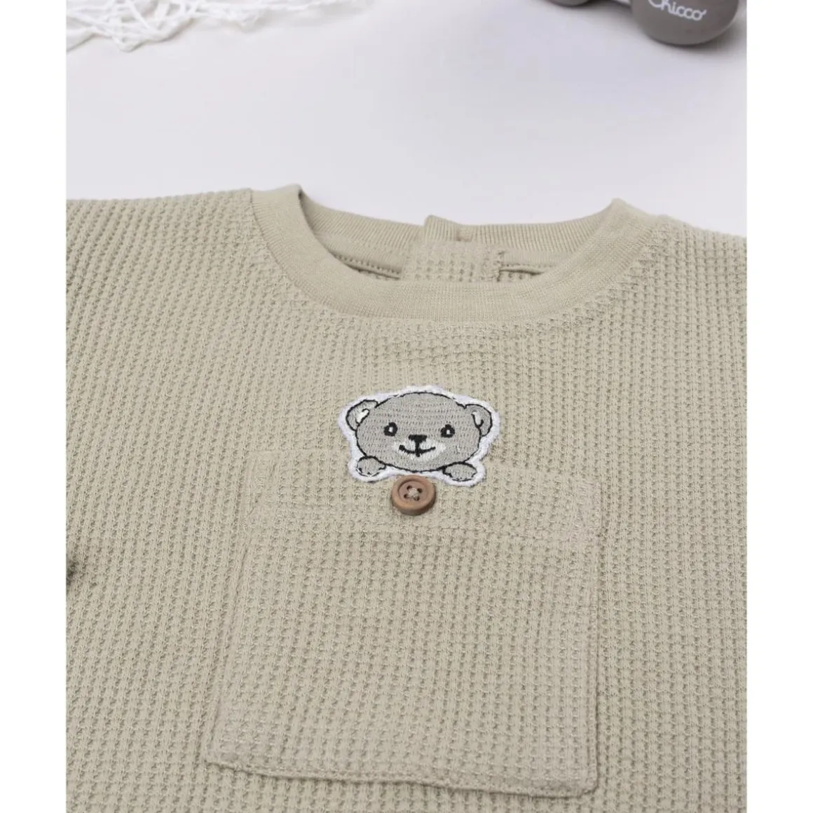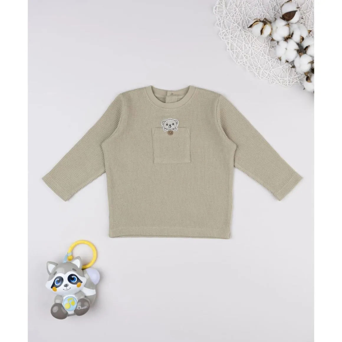 La camiseta de manga larga para niño en tejido waffle marrón es una prenda básica y cómoda con un toque especial. Incluye bolsillo frontal con bordado decorativo y cierre con botones en la espalda, que facilitan el vestir.