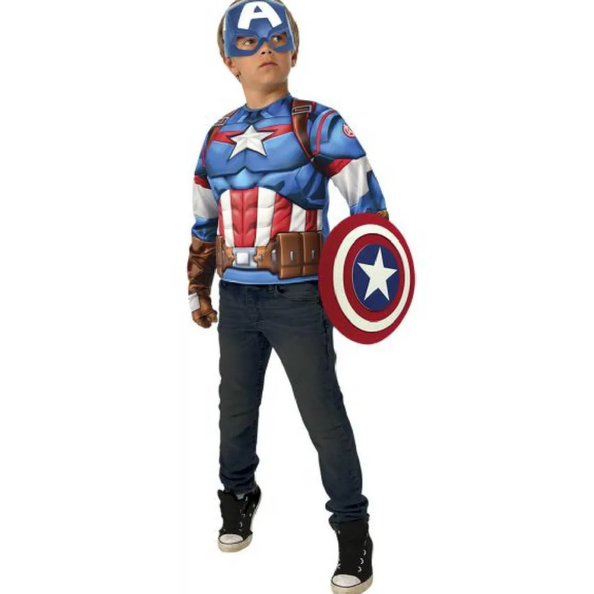 Capitán América – Disfraz 8-10 años, un top musculoso, máscara, guantes y escudo EVA.
