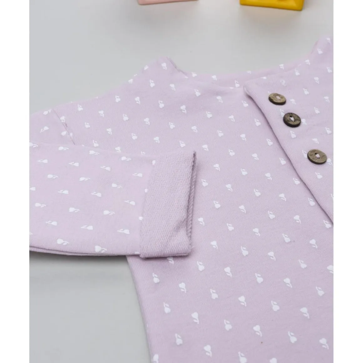 Cardigan cálido para bebé en rosa claro con micro estampado blanco allover. Apertura frontal con botones de madera. Puños con vuelta y parche inferior. Cuello redondo y ajuste cómodo.