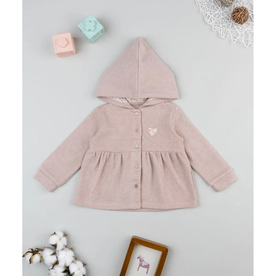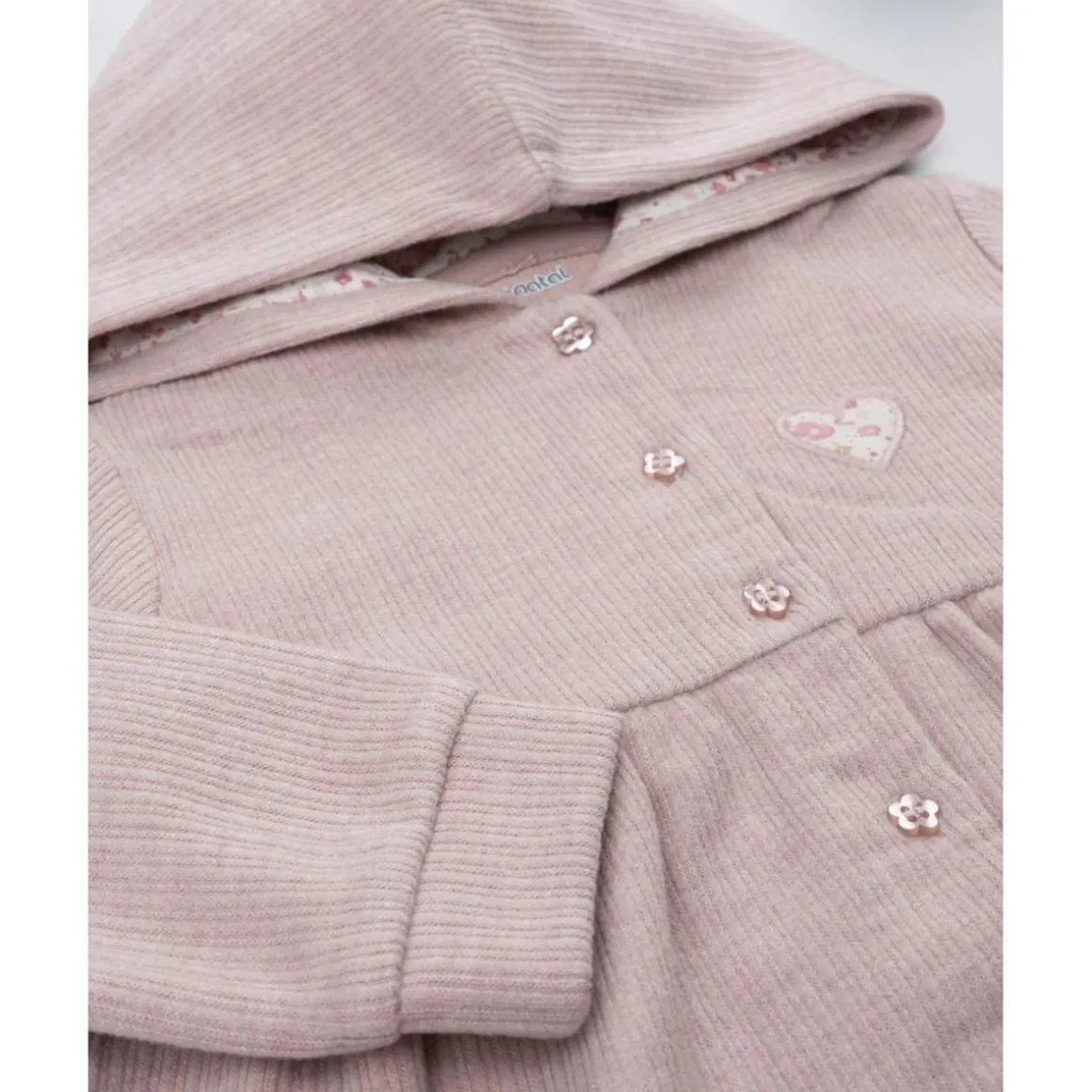 Características: Cardigan con capucha, color rosa claro, bordado discreto, botones frontales, corte suave y cómodo.