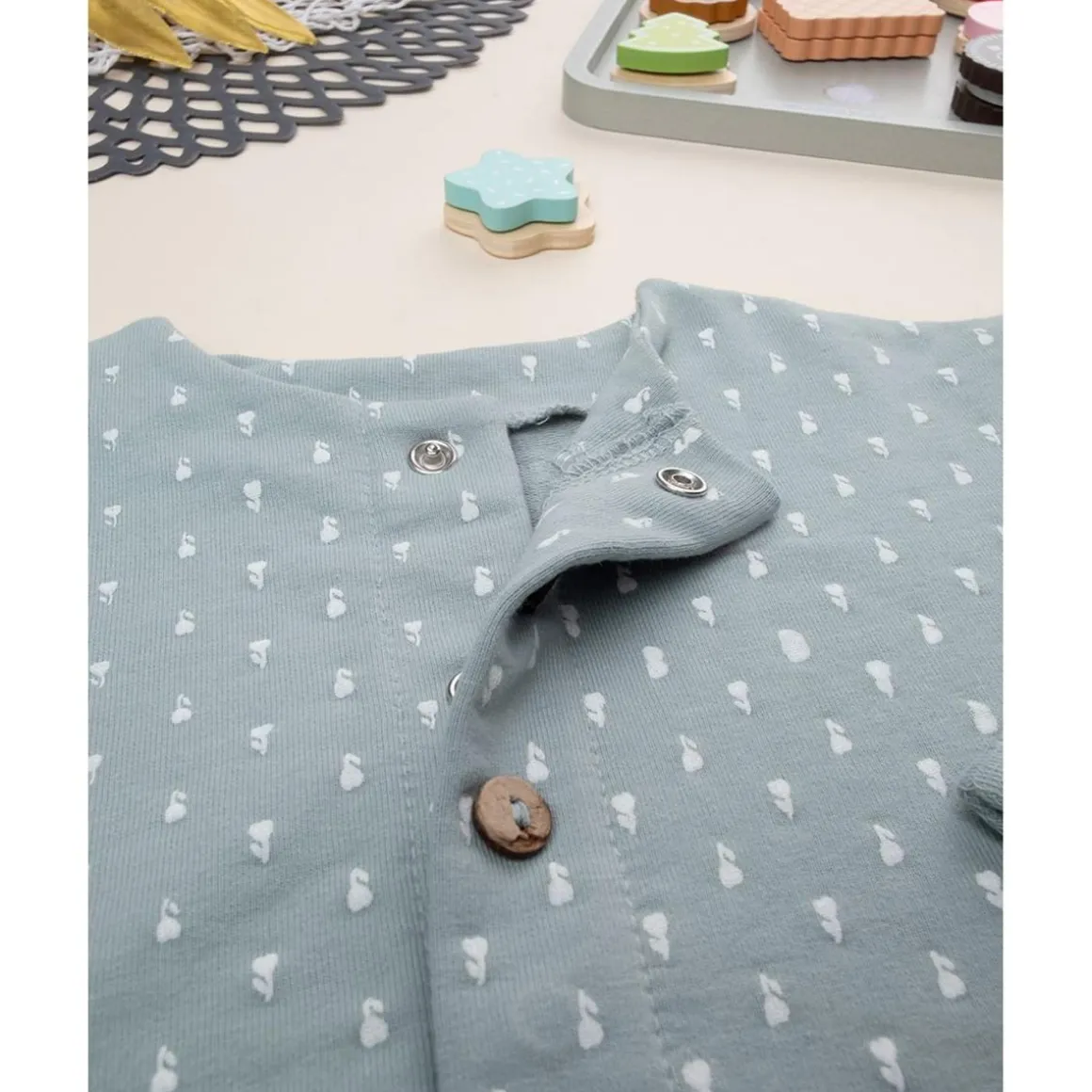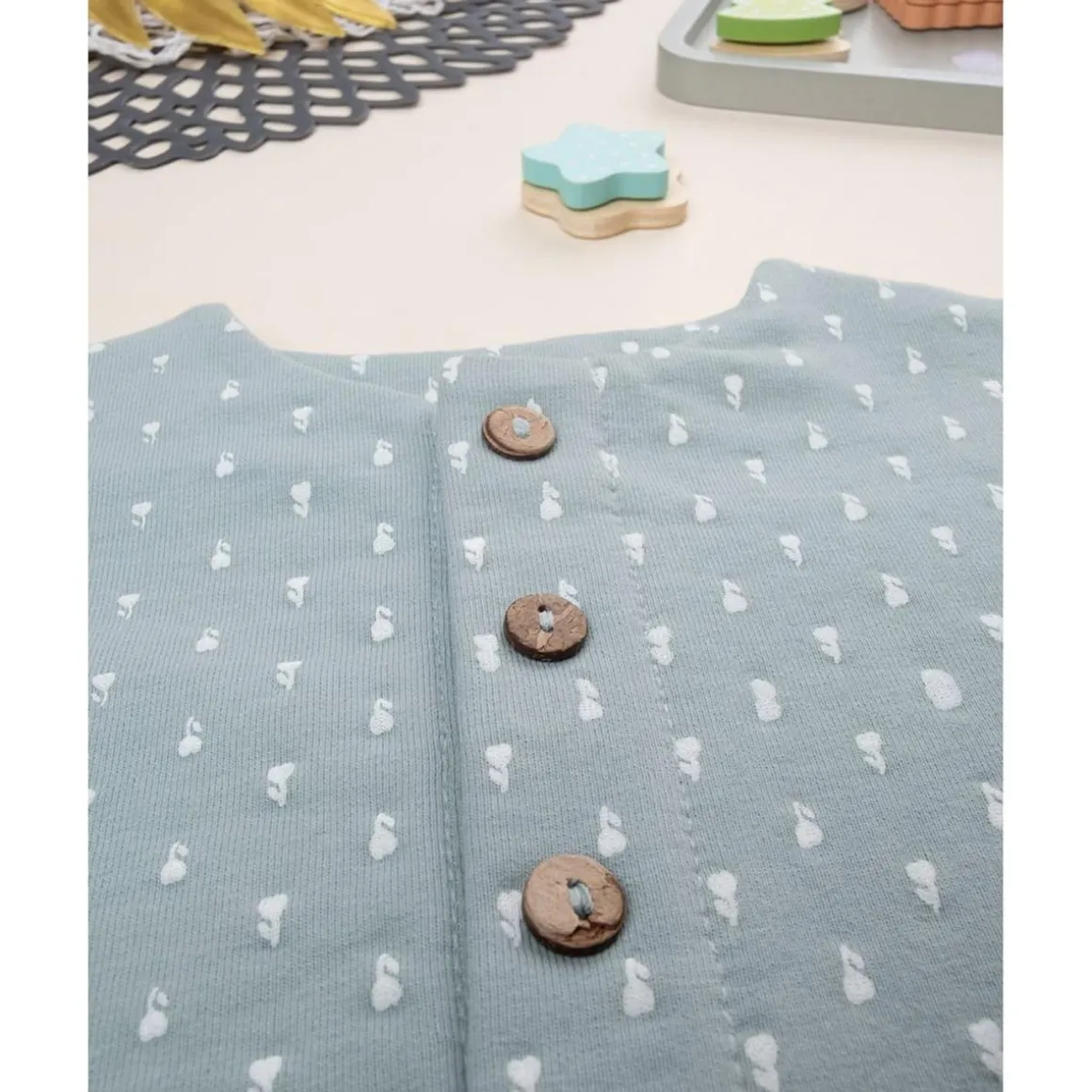 Cardigan casual para niña en verde con estampado allover tono sobre tono. Ajuste suave y práctico con botones al frente. Ideal para ocasiones casuales y formales. Algodón Oeko-Tex seguro para pieles sensibles.