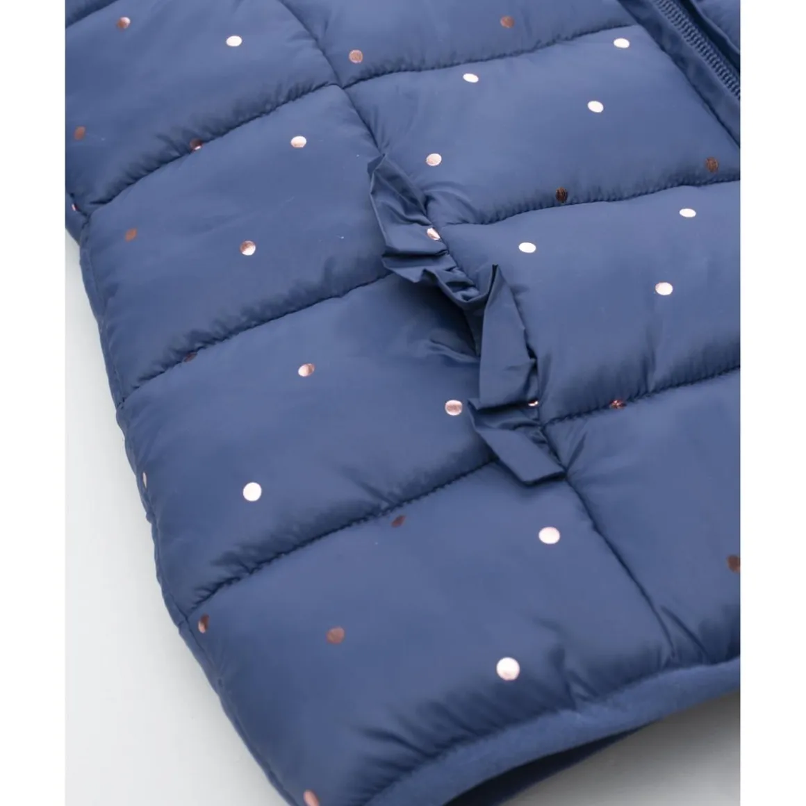 La cazadora con capucha en azul noche luce un estampado allover de corazones que aporta un aire alegre. Con cremallera frontal y bolsillos oblicuos, ofrece un ajuste cómodo para el día a día. Una prenda ligera y fácil de combinar para salidas casual.
