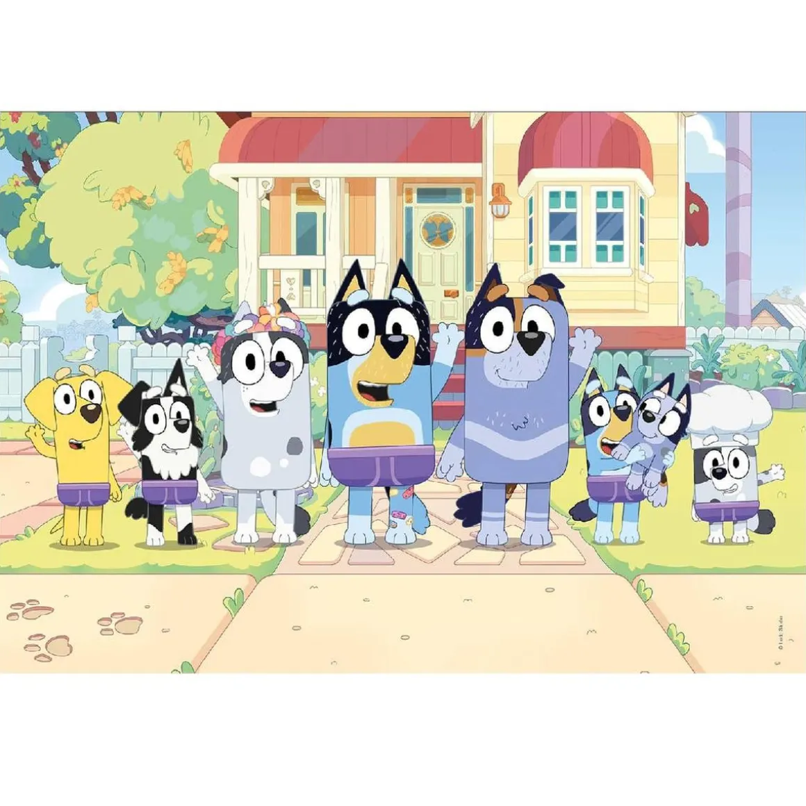 Puzzle 2: La familia posando delante de la casa, rodeada de detalles como juguetes, césped y risas que captan la atención y fomentan el montaje activo y exploratorio.