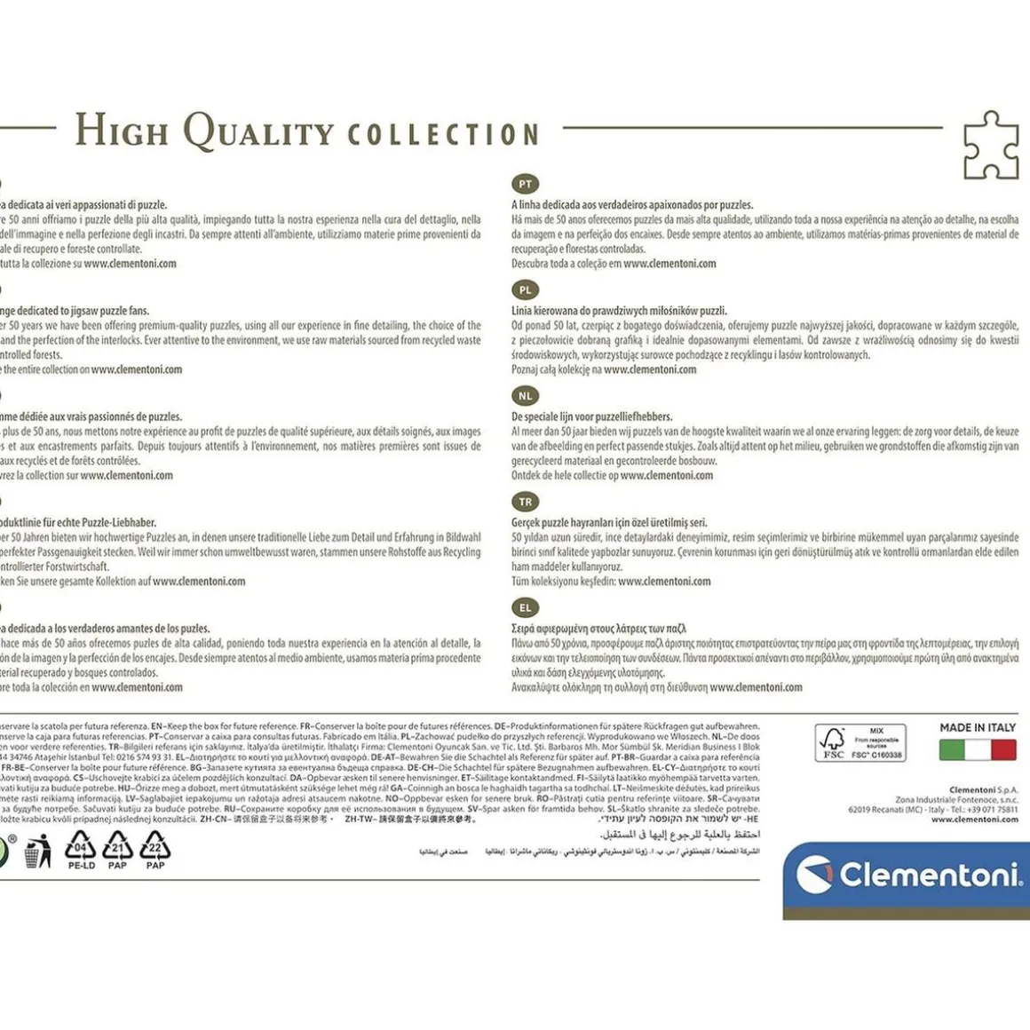 Con una dimensiones finales de 69 x 50 cm, este puzzle ofrece un desafío de tamaño completo. Cada pieza es una parte del puzle más grande, cada una es única y encaja a la perfección con las demás. Todo esto gracias a la gran calidad y fabricación de Clementoni. Este producto es hecho en Italia asegurando una gran calidad en cada pieza y en la imagen final.