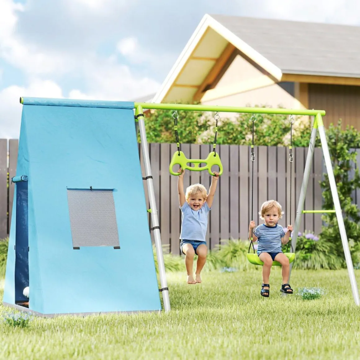 ¡Transforma tu jardín en un parque de diversiones lleno de diversión con este conjunto 3 en 1 de Aiyaplay! Perfecto para hasta cuatro niños de 3 a 8 años, incluye un columpio infantil, anillas de gimnasia y una tienda acogedora.