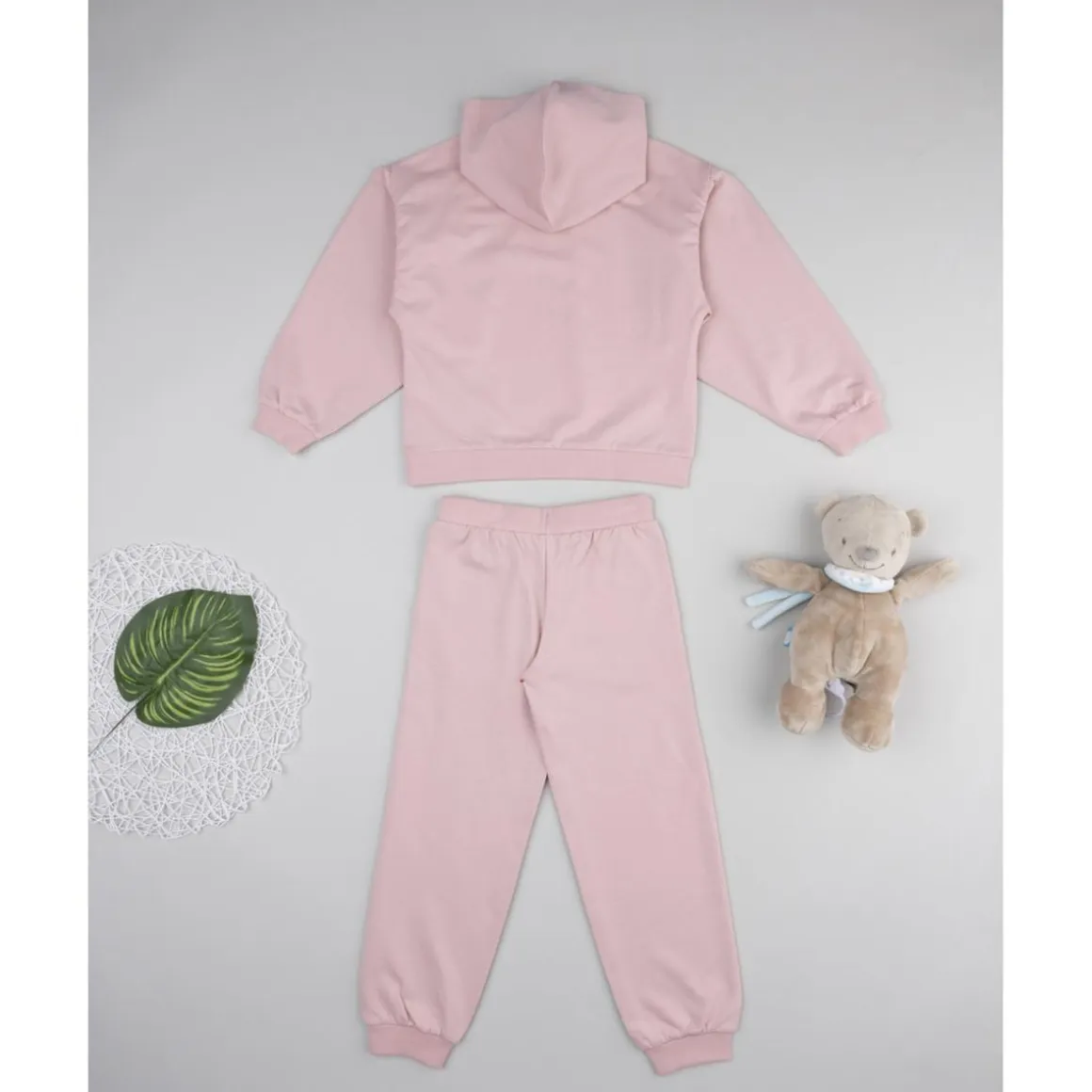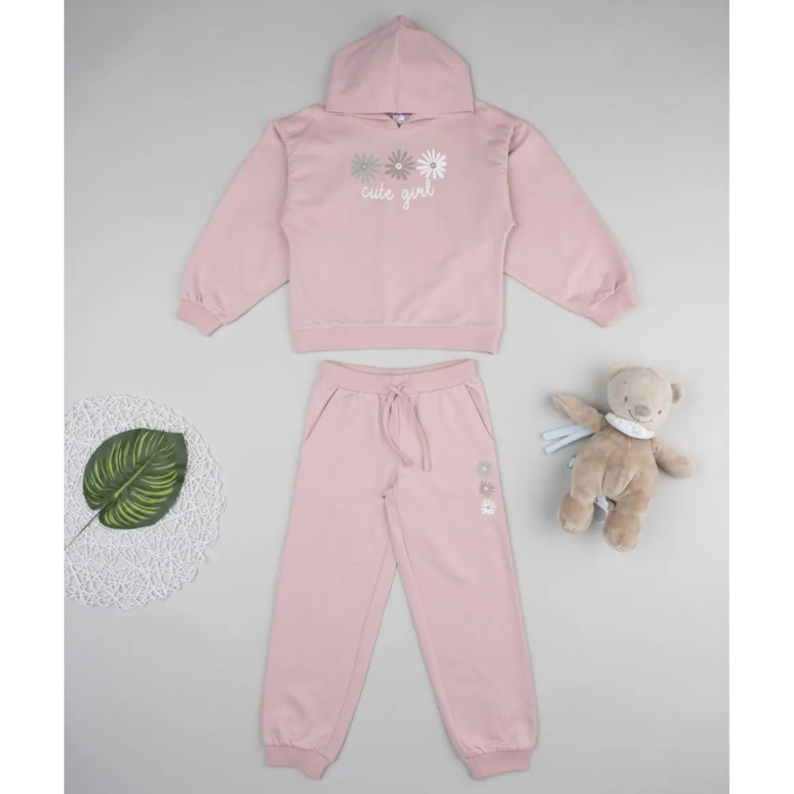Conjunto jogging de estilo casual para niña, en tejido french terry. Incluye sudadera con capucha y estampado de flores, y pantalón a juego con bolsillos. Cintura ajustable con cordón. Ideal para actividades cómodas y estilo sport.