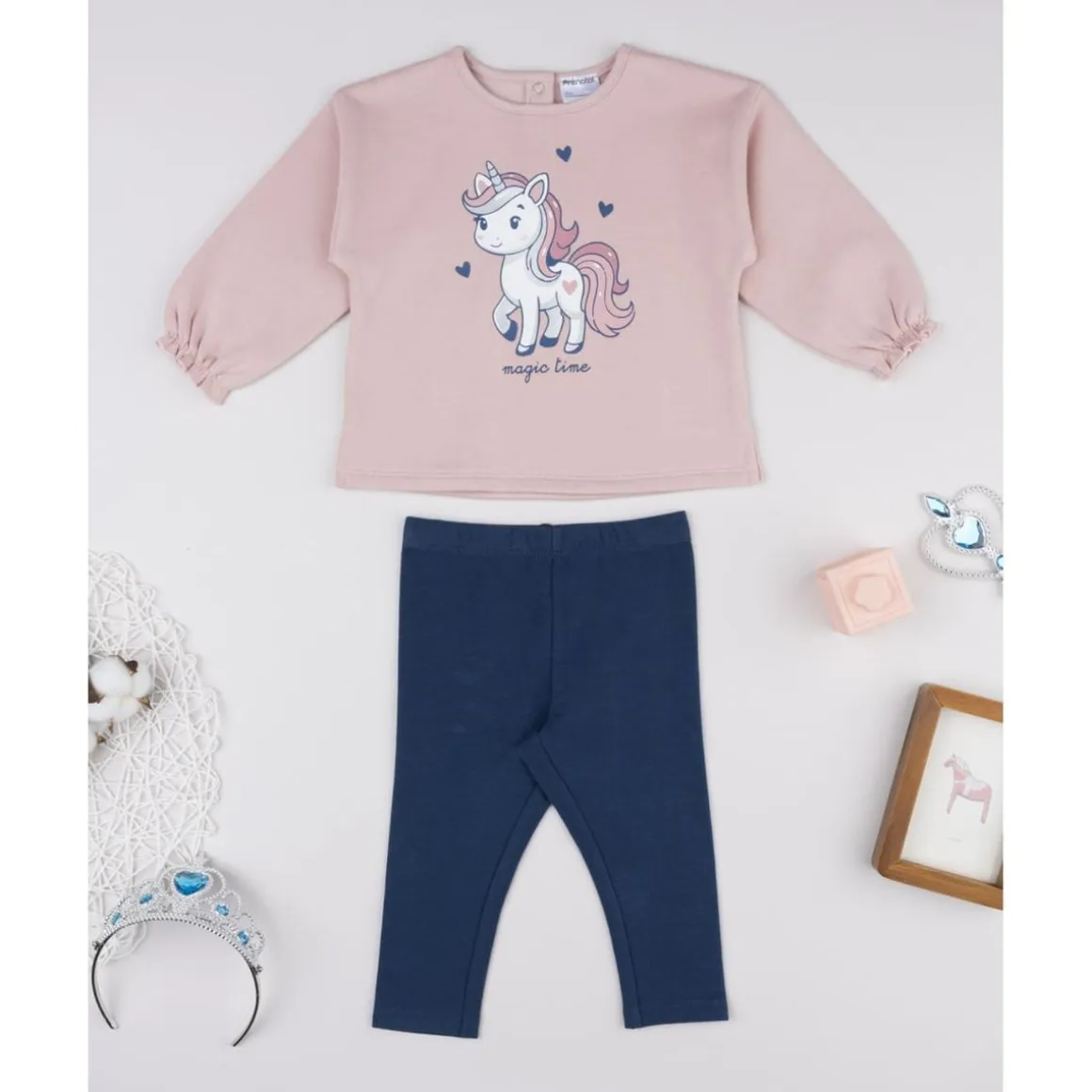 Alegre conjunto jogging para niña formado por sudadera rosa claro con estampado de unicornios y botones automáticos en la espalda, y leggings azul marino con cintura elástica. Una combinación cómoda y colorida para el día a día.
