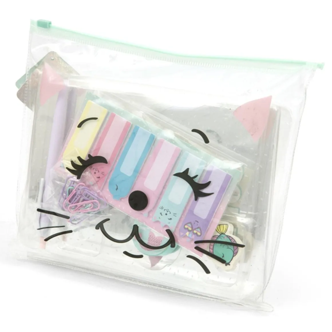 Creamania ofrece a los niños diversos accesorios de oficina y pegatinas, todo en una hermosa cartera transparente con una adorable cara de gato en la tapa.