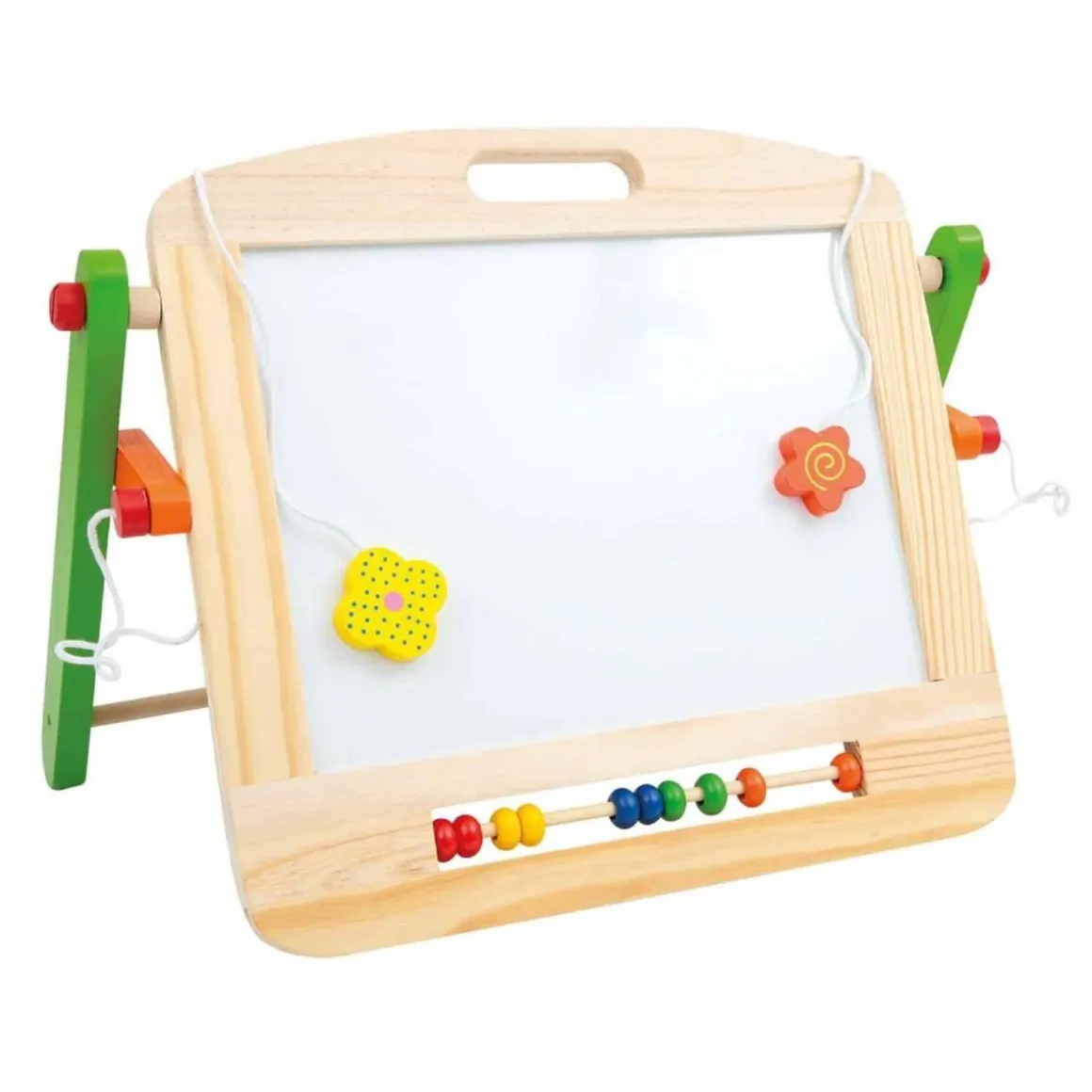 Esta pizarra de madera tiene dos lados: uno negro para dibujar con tiza y una superficie blanca magnética para pegar y jugar con formas de colores.