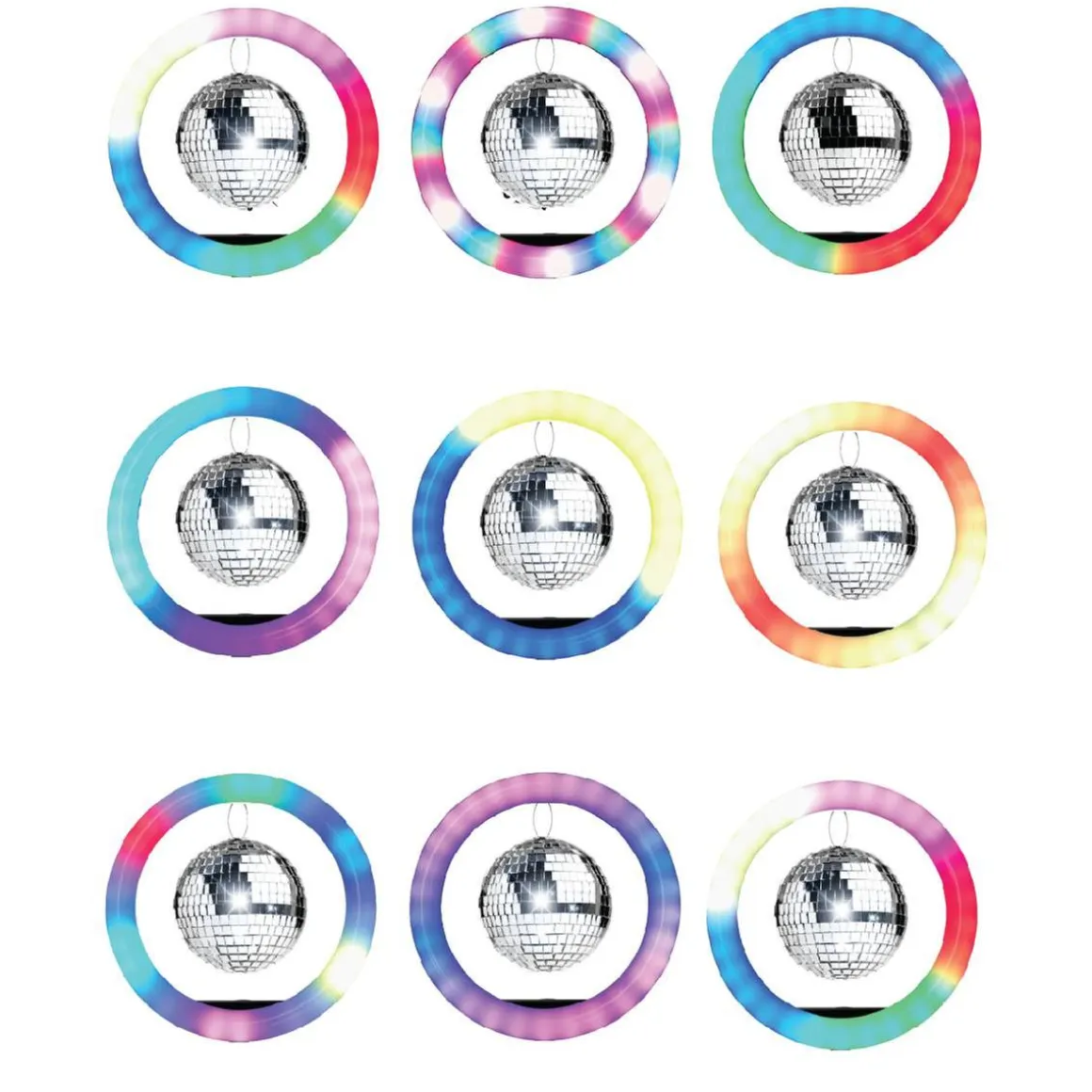 Disco Ring aro de luz 10” con LEDs, un anillo luminoso con trípode, bola de discoteca y control remoto.