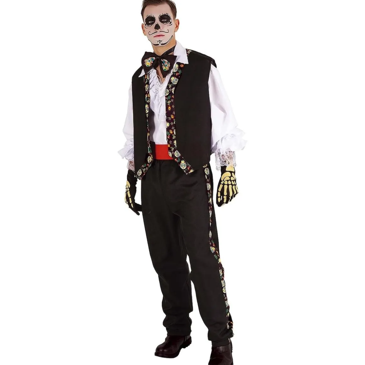 El personaje de Catrín es cada vez más famoso en la celebración de la fiesta del día de los muertos, convirtiéndose en una opción popular para las fiestas de Halloween. Este disfraz incluye chaleco, pajarita y guantes, proporcionando un look completo y auténtico.