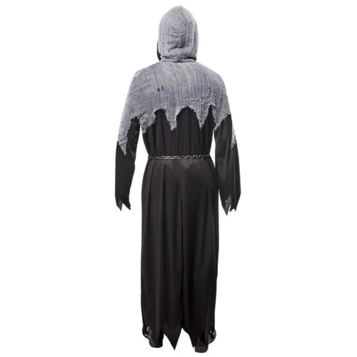 - Incluye: Túnica negra con capucha y detalles de gasa, guantes impresos y cadena.