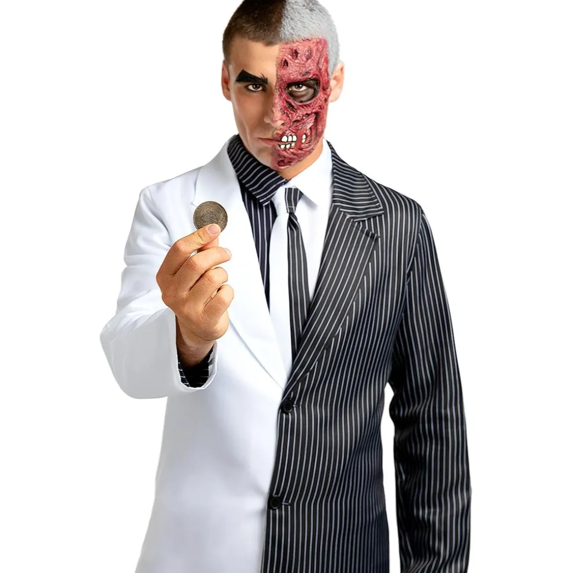 Este disfraz en talla Standard es perfecto para encarnar a Dos Caras, el villano más ambivalente de Gotham. Consta de pantalón, chaqueta, camisa y corbata con diseño asimétrico, que representan la dualidad del personaje. La máscara y la moneda completan el conjunto, logrando un look escalofriante y auténtico.
