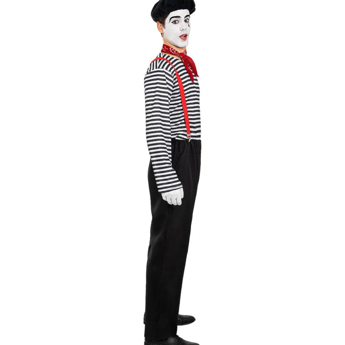 Tirantes ajustables sobre pantalón de corte tradicional, complementado con guantes sin dedos y pañuelo de seda artificial. Diseño atemporal que rinde homenaje al arte del silencio con estilo parisino.