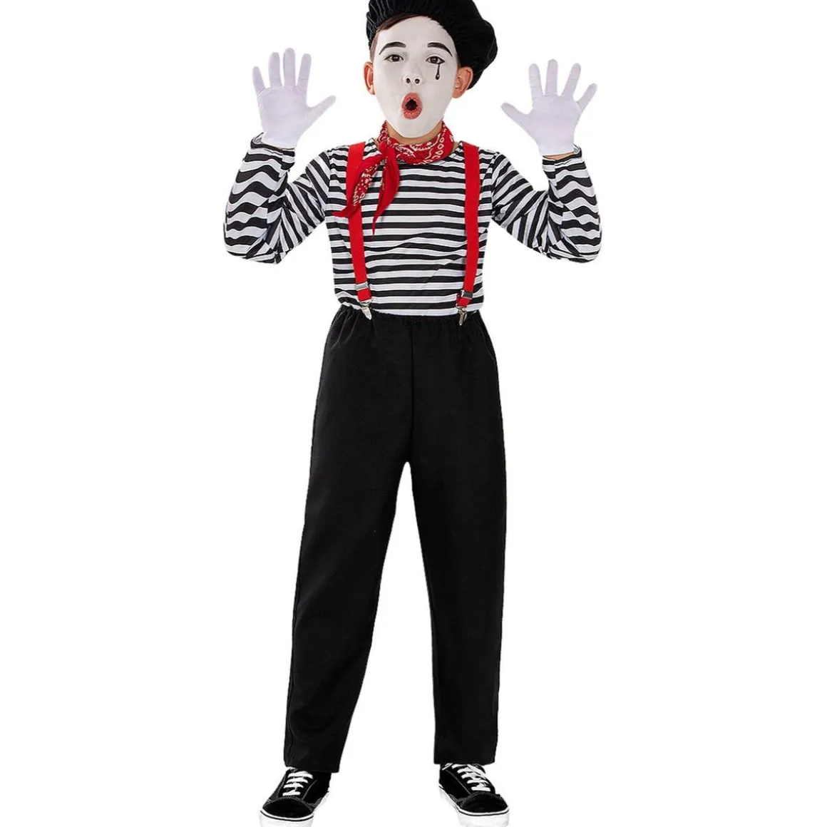 Este disfraz de mimo para niño hará que tu pequeño deslumbre con su actuación. Consta de un pantalón con tirantes, camiseta blanca de manga larga, boina negra, un pañuelo rojo y guantes blancos. Ideal para disfraces originales y espectáculos.