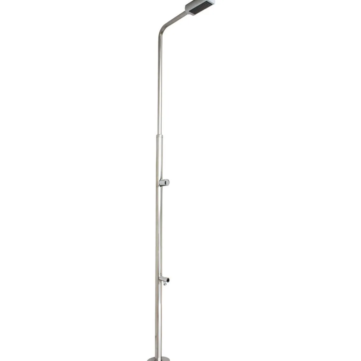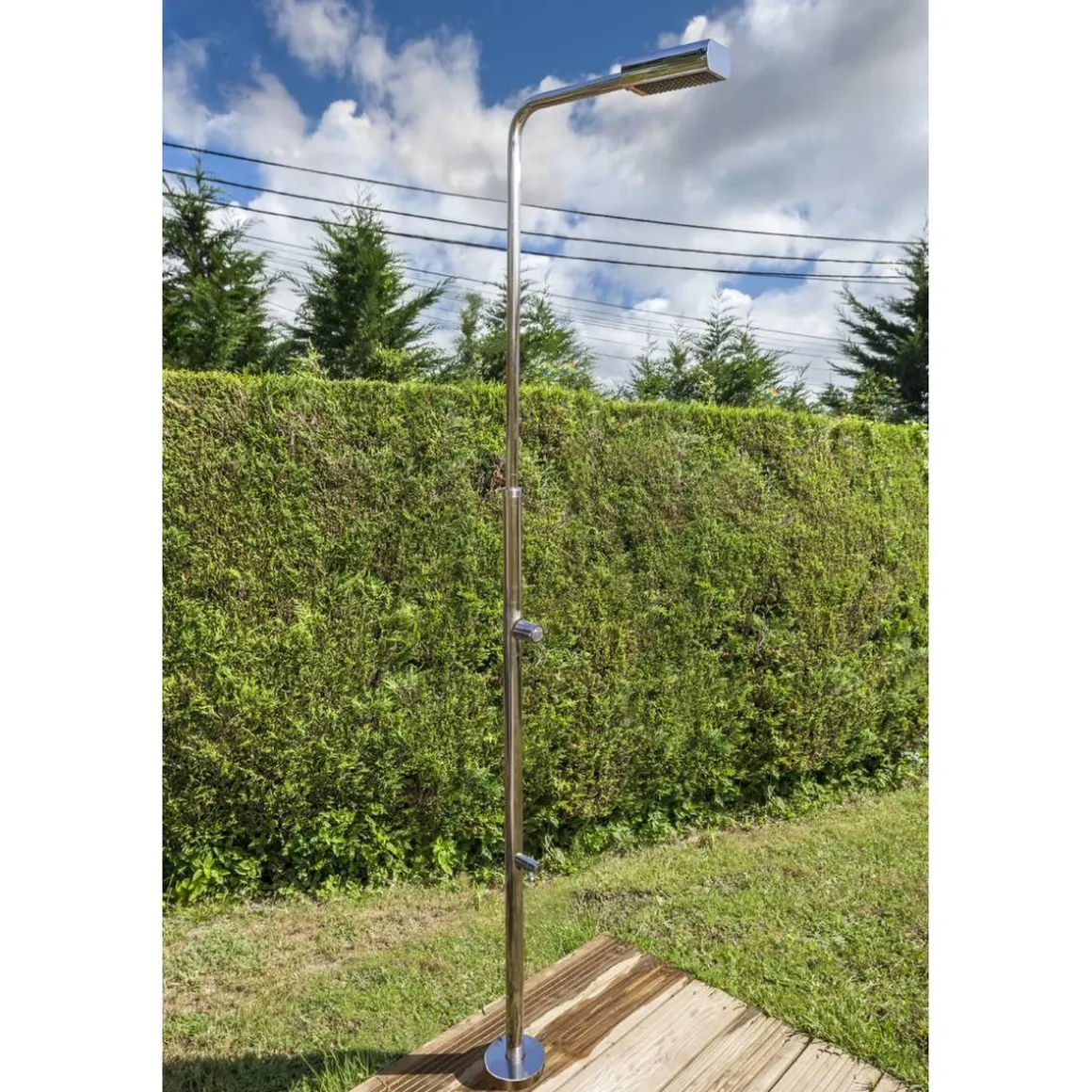 Ducha de acero con grifo lavapiés, una ducha de acero inoxidable que se integra perfectamente en el jardín.