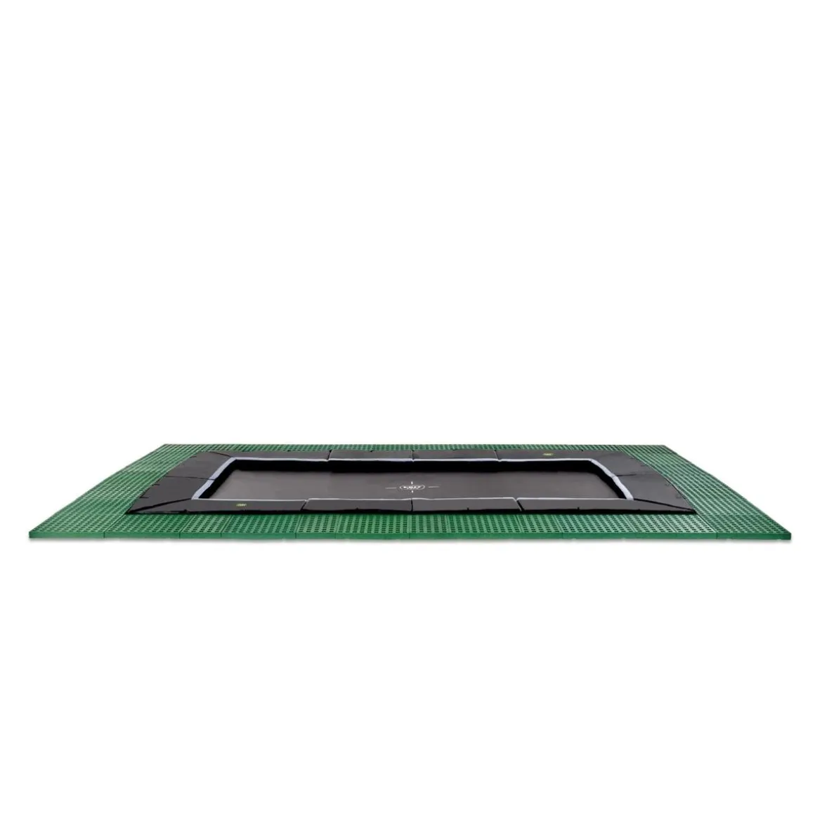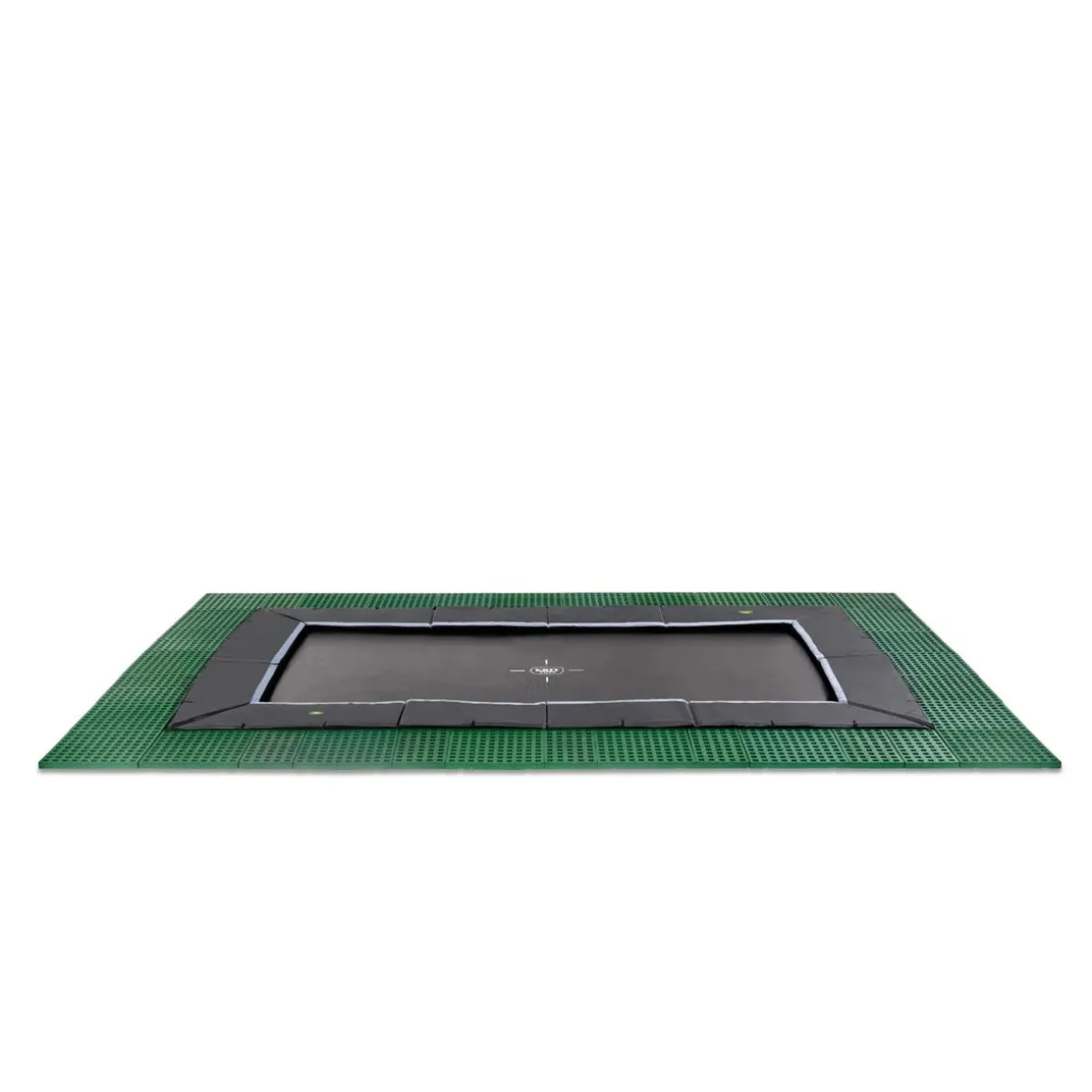 El trampolín Dynamic se instala a nivel del suelo completamente enterrado. El protector acolchado está al mismo nivel que el césped, por lo que el trampolín está totalmente integrado en el resto del jardín.