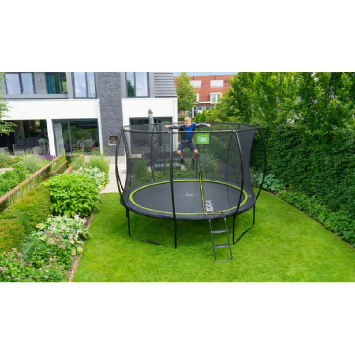 La red de seguridad es una característica estándar entregada con este trampolín. El trampolín está equipado con soportes curvos para que la red se estire firmemente. El borde protector de alta calidad cubre completamente los resortes galvanizados y está equipado con un sistema de protección de pies especialmente desarrollado que evita que su pie se atasque entre los resortes. Los robustos muelles garantizan una gran potencia de salto. El marco del trampolín Silhouette está galvanizado y recubierto de polvo para evitar la oxidación.