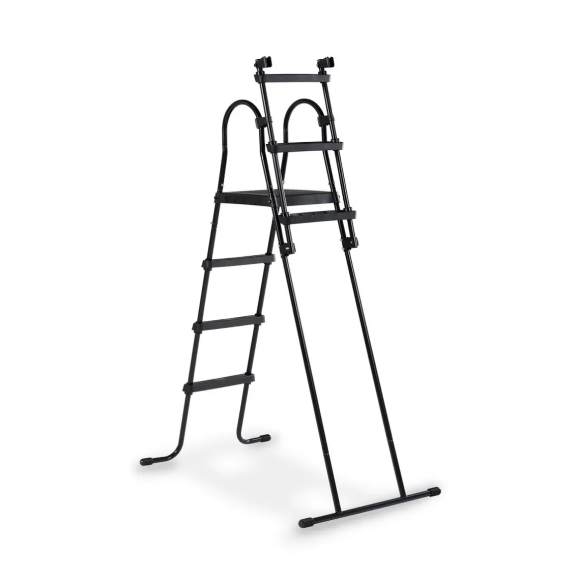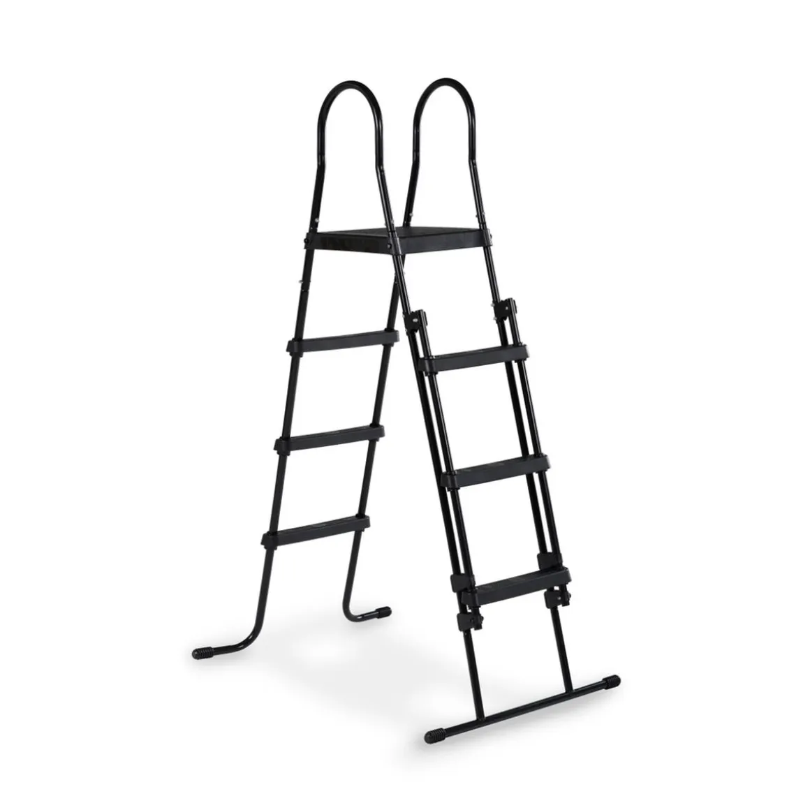 La escalera negra tiene una barandilla a la que los niños pueden agarrarse y los escalones tienen una capa antideslizante para que los niños no se resbalen cuando estén mojados. La escalera tiene una plataforma en el medio para facilitar que los niños salten sobre el borde de la piscina. La escalera también se puede plegar fácilmente desde el exterior de la piscina, una característica útil para que los más pequeños no puedan simplemente subir a la piscina.